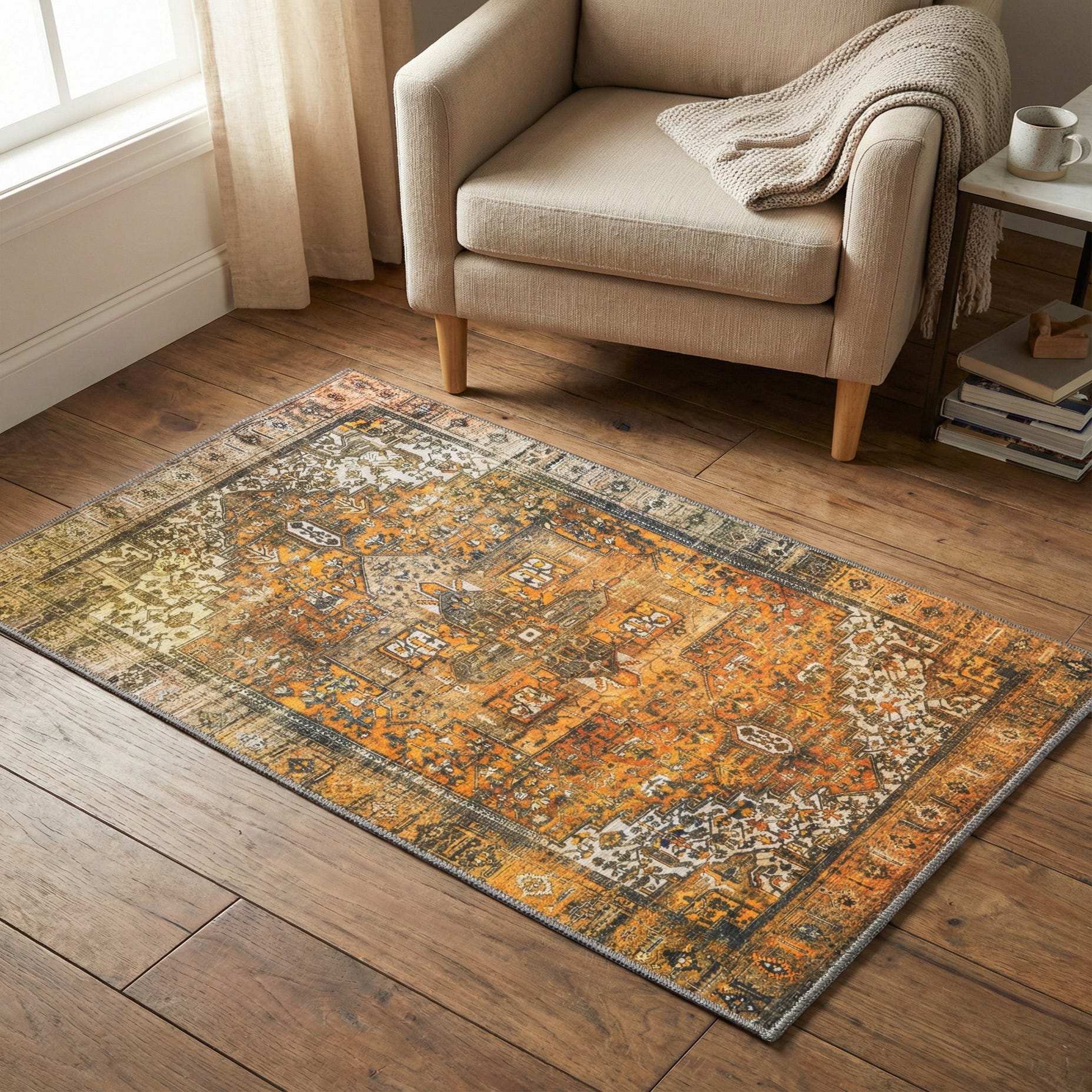 This piece works well as a grounding accent in smaller spaces — place it at an entry, in front of a sofa, beside a bed, or layered over a neutral rug to add color and pattern. It pairs naturally with warm wood tones and leather seating, and complements transitional, bohemian, mid-century modern, or industrial interiors where a touch of vintage character and warm yellow-orange tones will brighten the palette without overwhelming the room.