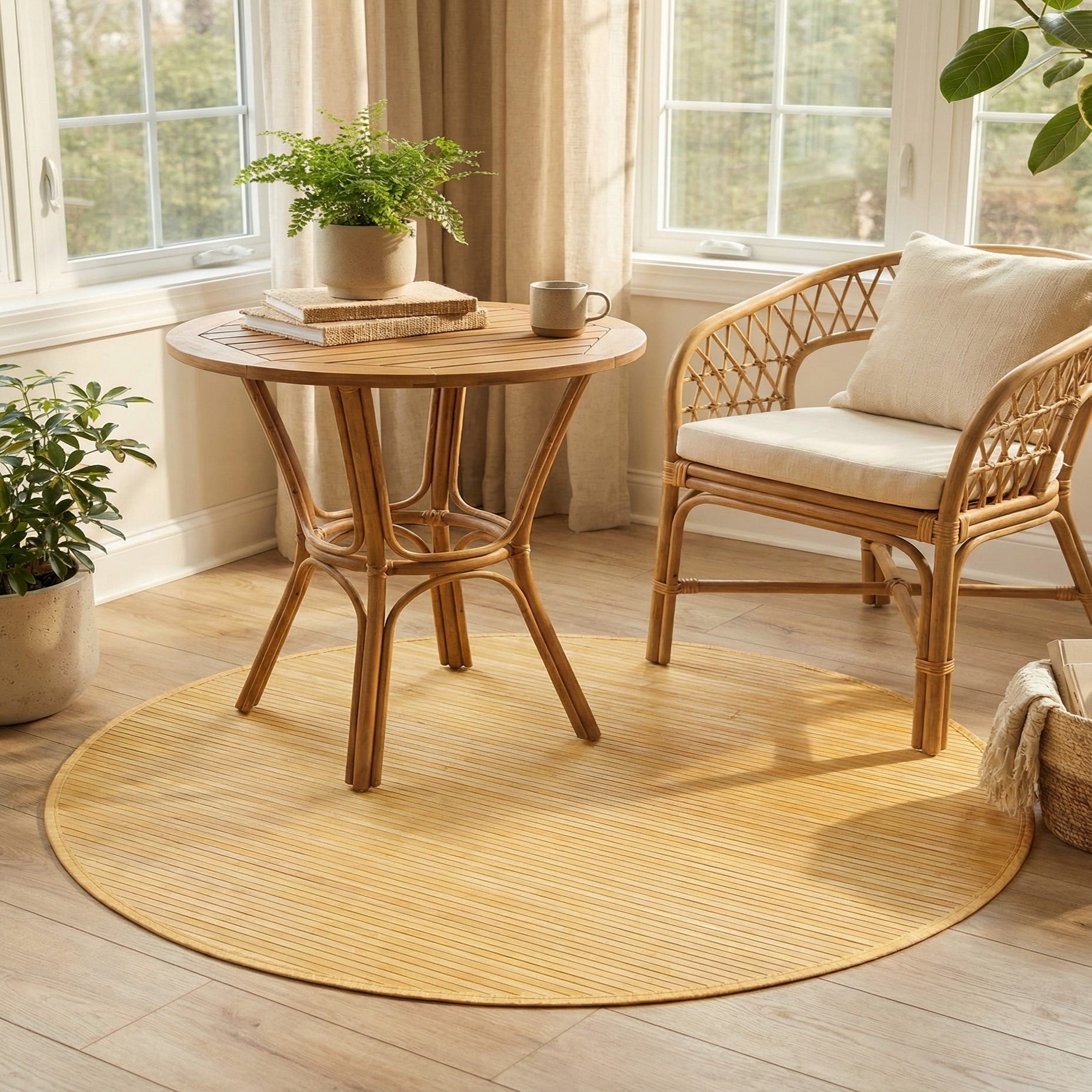 Machine-made from 100% bamboo, this round rug presents tightly aligned bamboo slats that create a clean, linear pattern across the surface. The dominant yellow background carries warm honey undertones and subtle tonal streaks of natural grain, offering gentle variation rather than a uniform color field. The texture is firm and smooth to the touch, with slight ridging along each bamboo strip and a low-profile silhouette that lays flat against the floor, finished with a neatly bound edge.