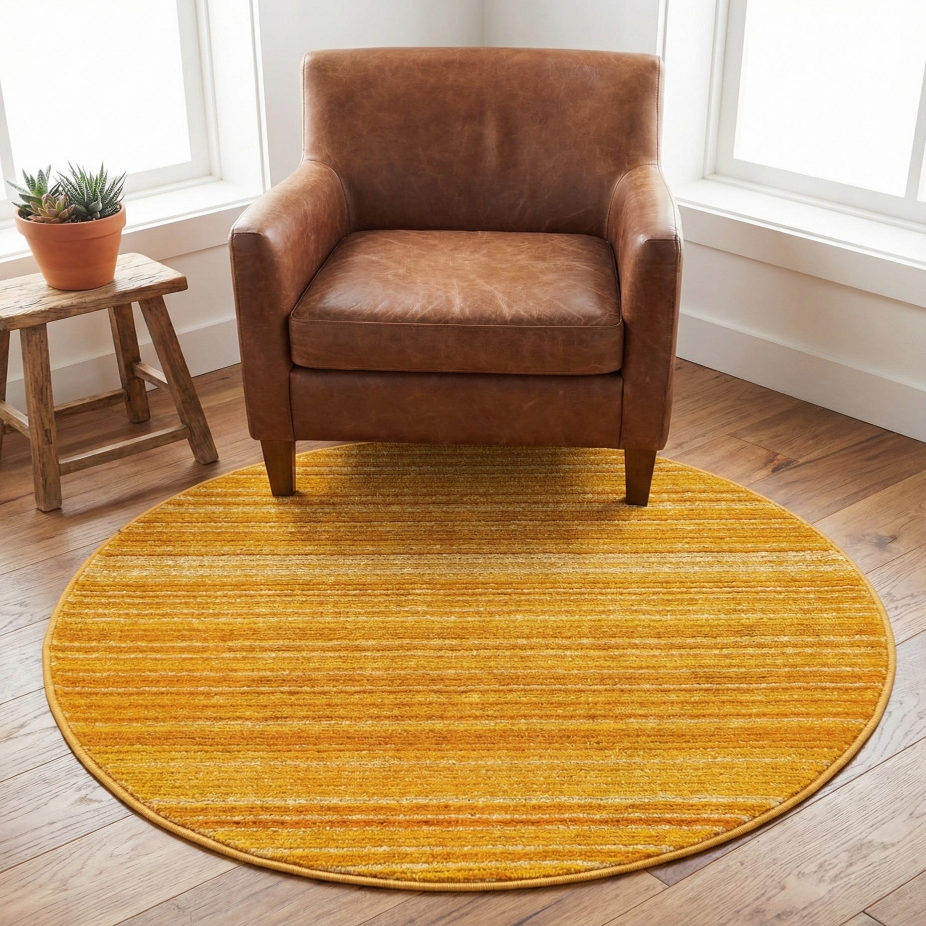This round shape is well suited to small seating nooks, a breakfast nook or under a compact café table, and it can also add a cheerful anchor to a reading corner or entryway. Pair it with natural wood furniture, white or navy accents, and woven textiles for a contemporary or mid-century look, or layer it with textured pillows and rattan pieces for a casual, bohemian feel.