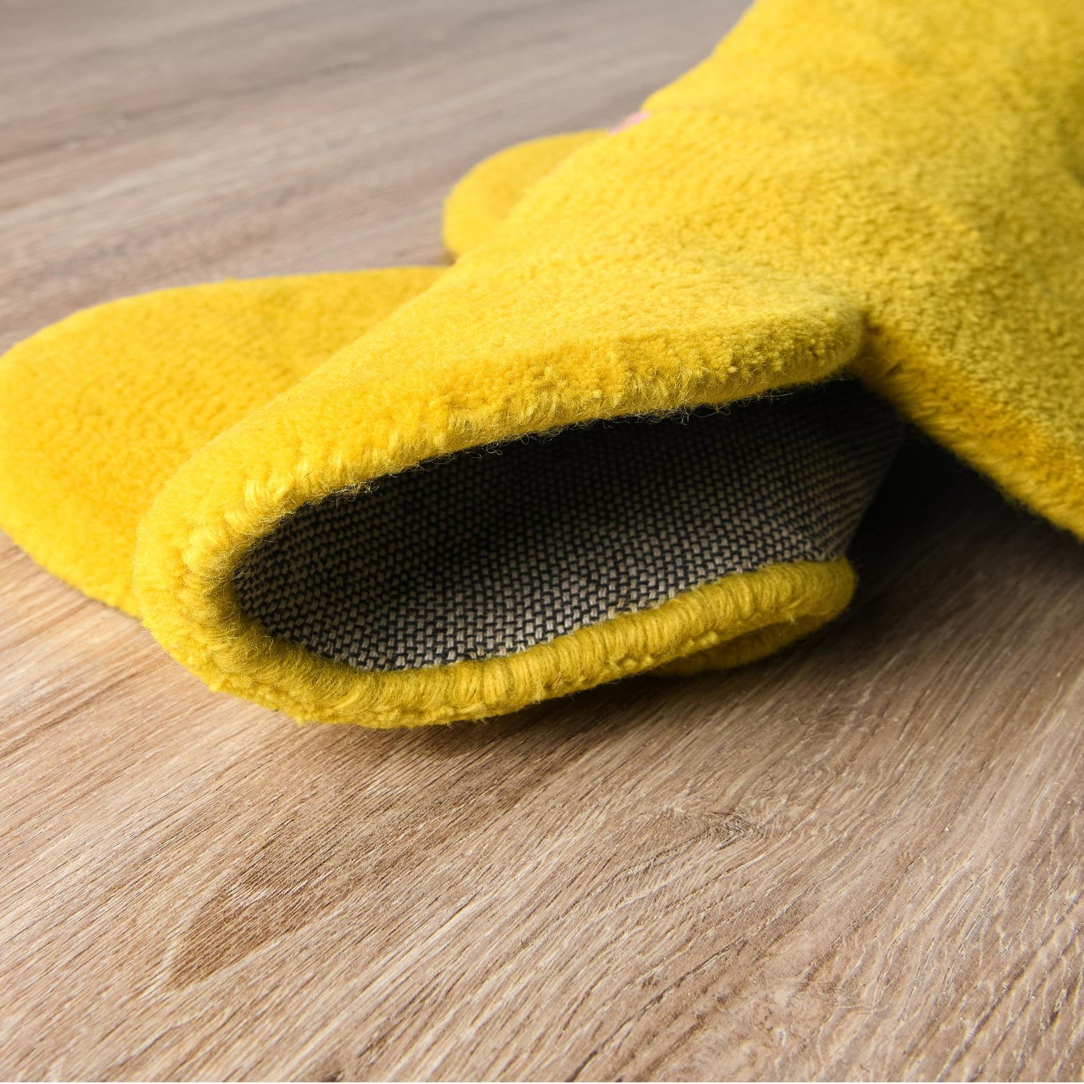A vibrant yellow flower-shaped rug with a bright pink center, made of soft wool, perfect for a playful room.