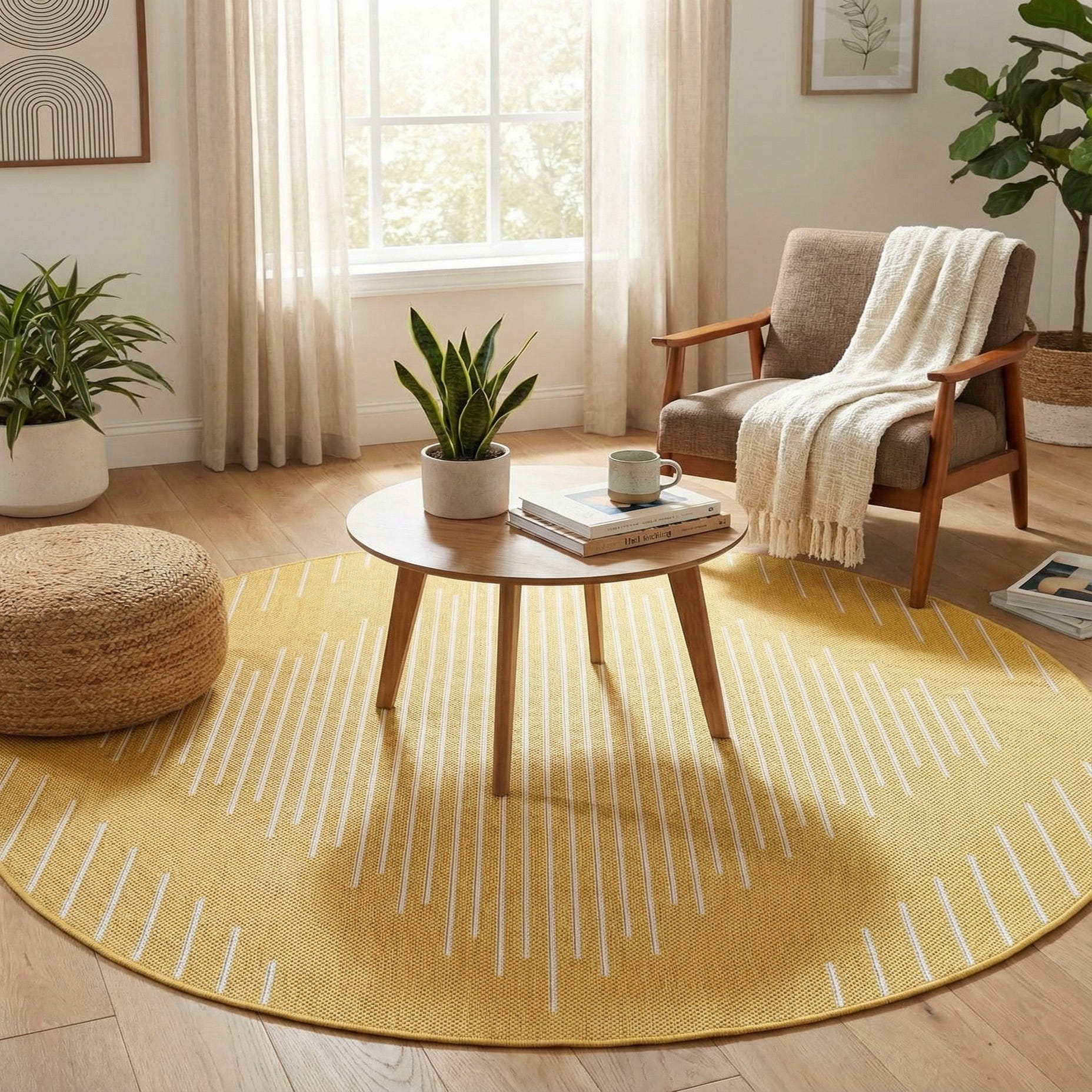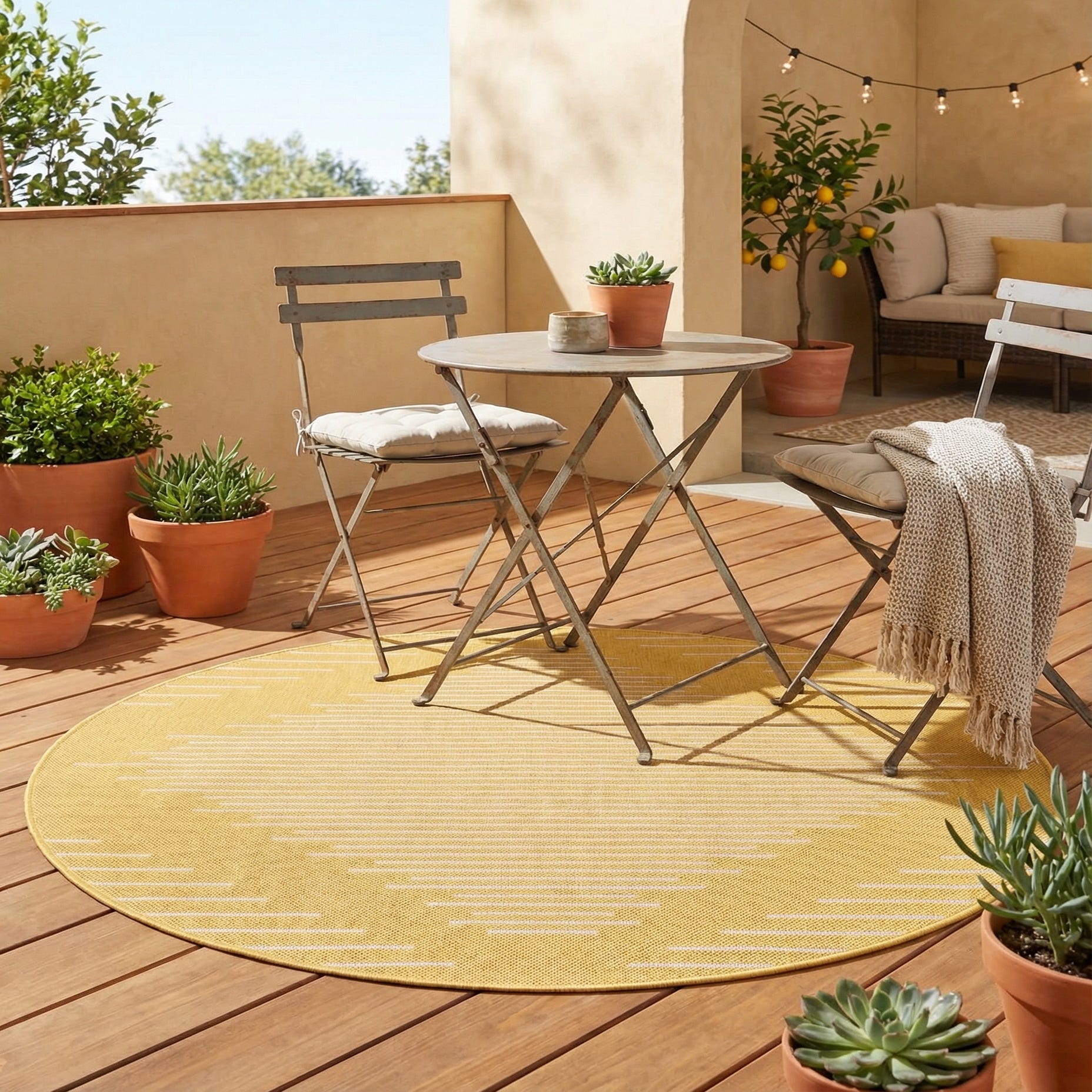 A 3' round yellow polypropylene rug with a modern Southwestern-inspired white stripe pattern, suitable for indoor or outdoor use.