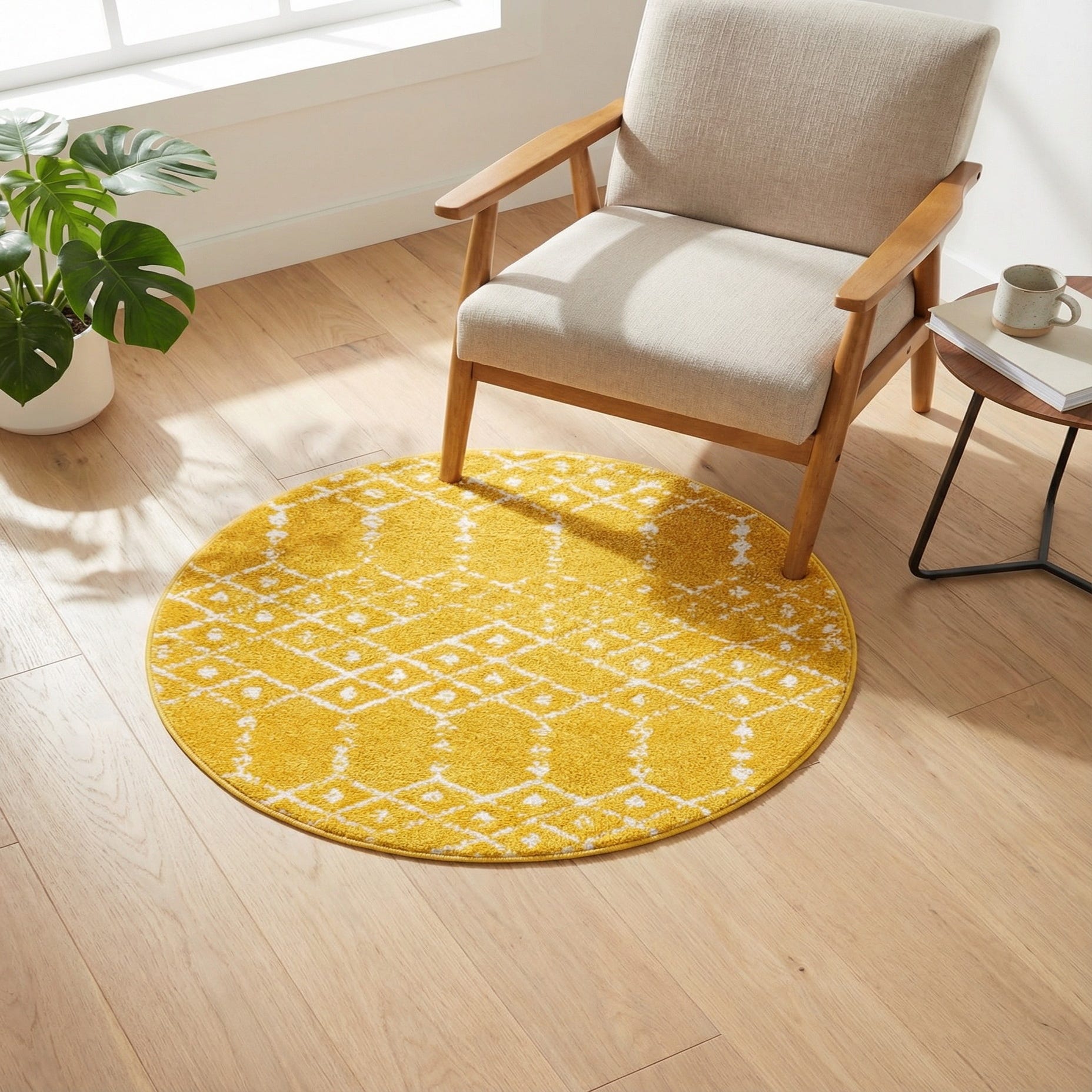 This round shape and cheerful color work well as a focal anchor in an entry, sun-filled kitchen, breakfast nook, or a cozy reading corner. Pair it with light wood furniture and crisp whites for a fresh, modern farmhouse look, add natural woven accents and layered textiles for a relaxed bohemian vibe, or use it to brighten a contemporary space with navy or gray accessories for contrast.