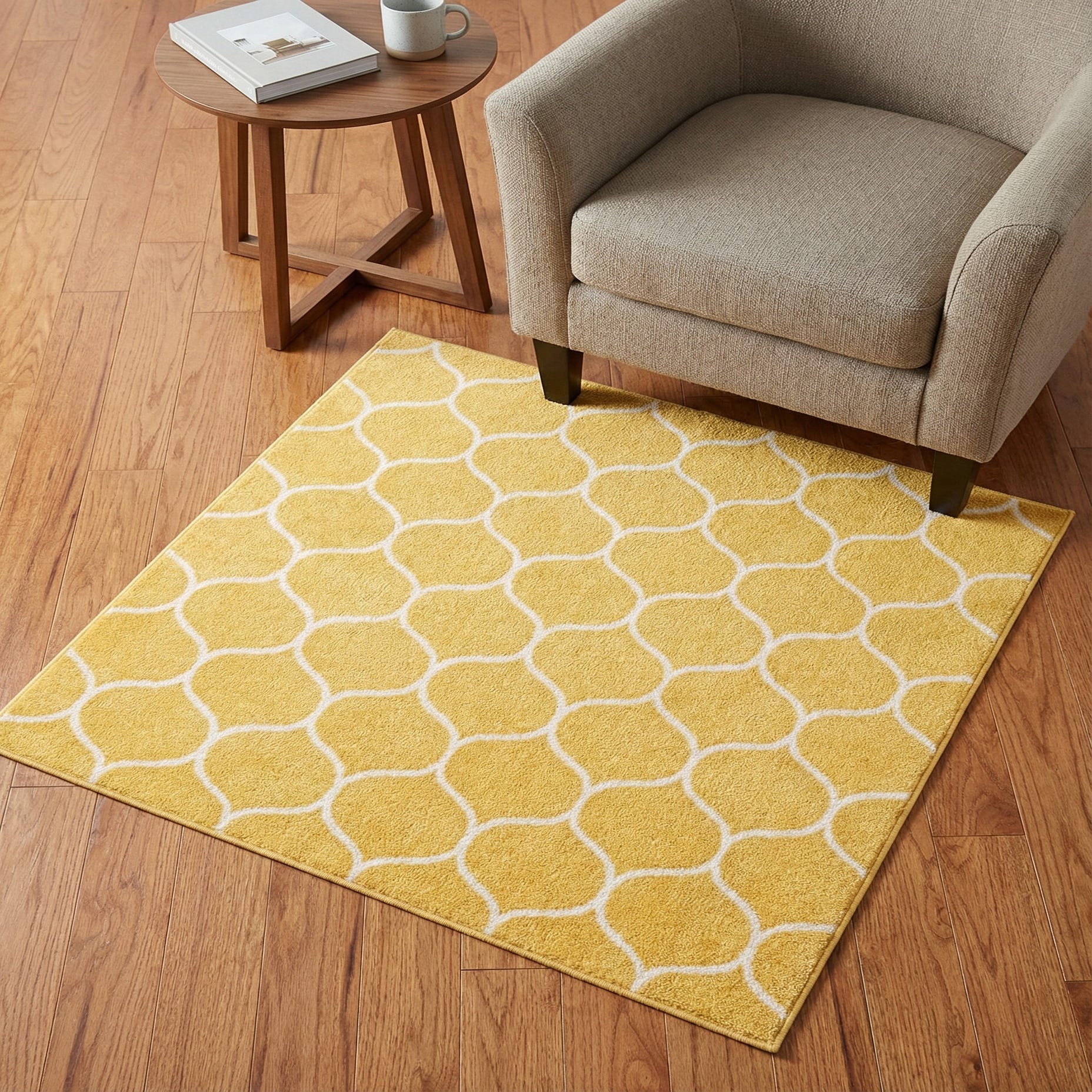 A cheerful yellow field sets the stage for a repeating ivory lattice pattern of rounded ogee shapes, creating a balanced geometric rhythm across the surface. Machine made of 100% polypropylene, the rug has a soft, even pile that feels smooth underfoot while the pale ivory lines provide a subtle tactile contrast. The overall look is modern with a nod to classic trellis motifs, making the design both fresh and familiar.