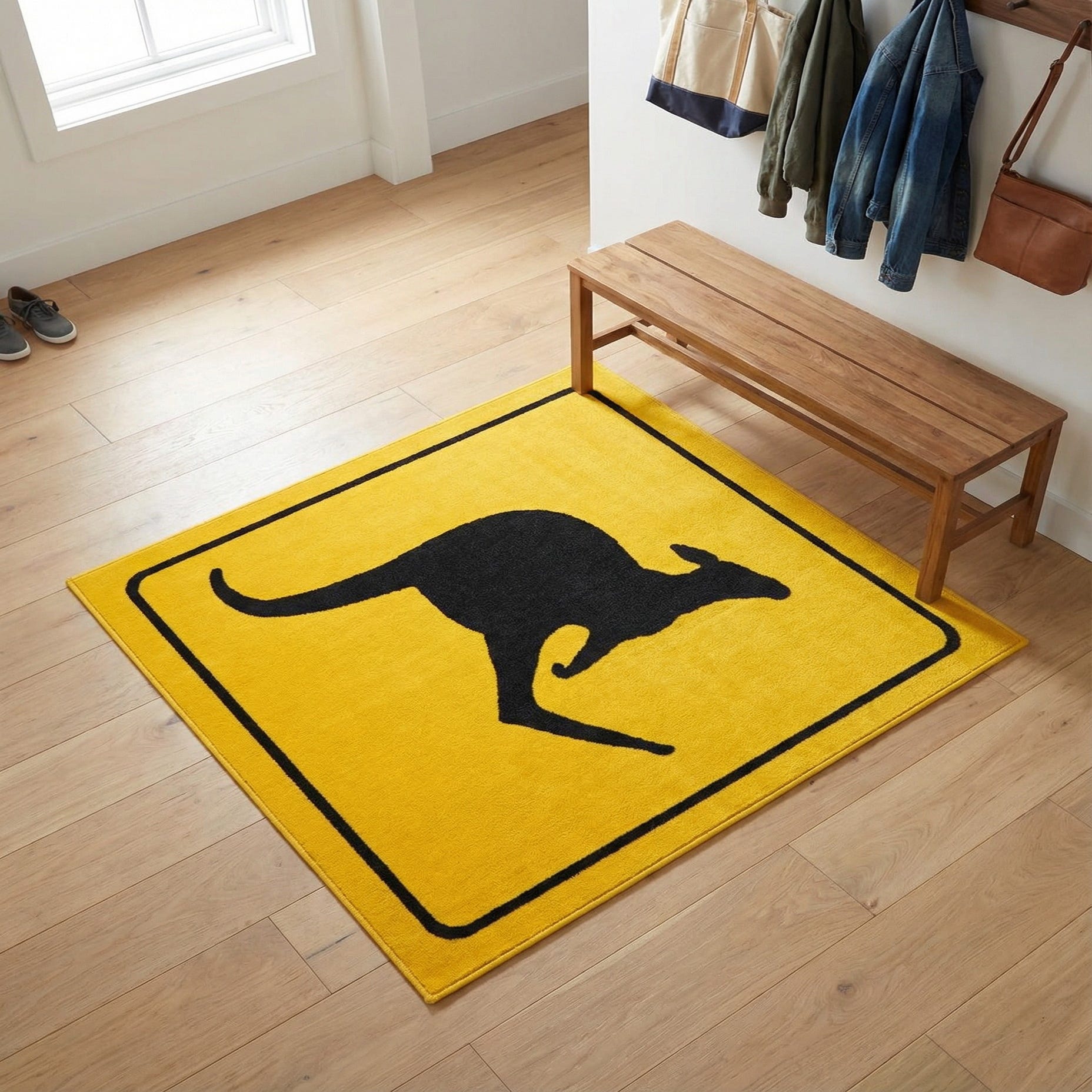 A bold black kangaroo silhouette sits squarely on a bright yellow ground, framed by a thin black rounded-diamond border for a clear, graphic look. The contrast between the black motif and the yellow field is striking yet simple, and the machine-made polypropylene construction gives the surface a low, dense pile that feels smooth underfoot. The black areas have a slightly firmer texture against the softer yellow background, adding a subtle tactile dimension without changing the clean lines of the pattern.