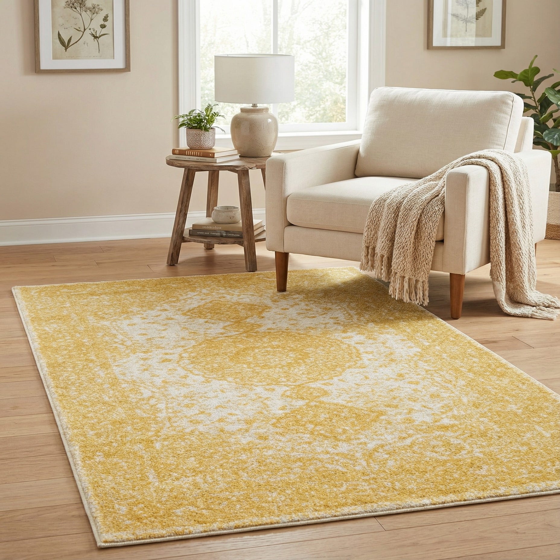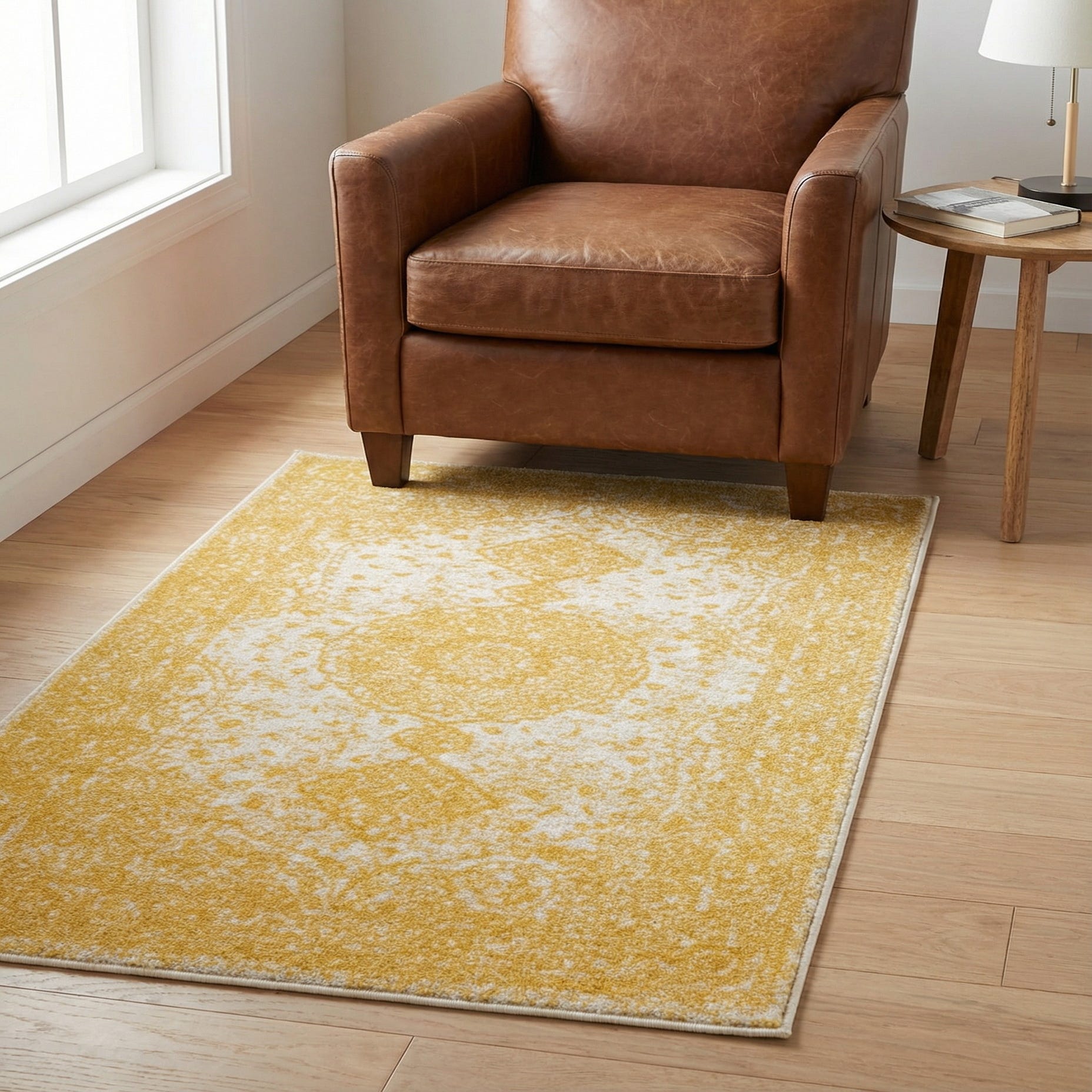 This rug works well anywhere you want a pop of sunny color without heavy formality — try it in an entry, a kitchen, layered in front of a sofa, or to anchor a cozy reading corner. Pair it with natural wood tones, white or neutral upholstery, and matte metal accents for a modern-meets-vintage feel, or use it to brighten a minimalist or Scandinavian-inspired space.