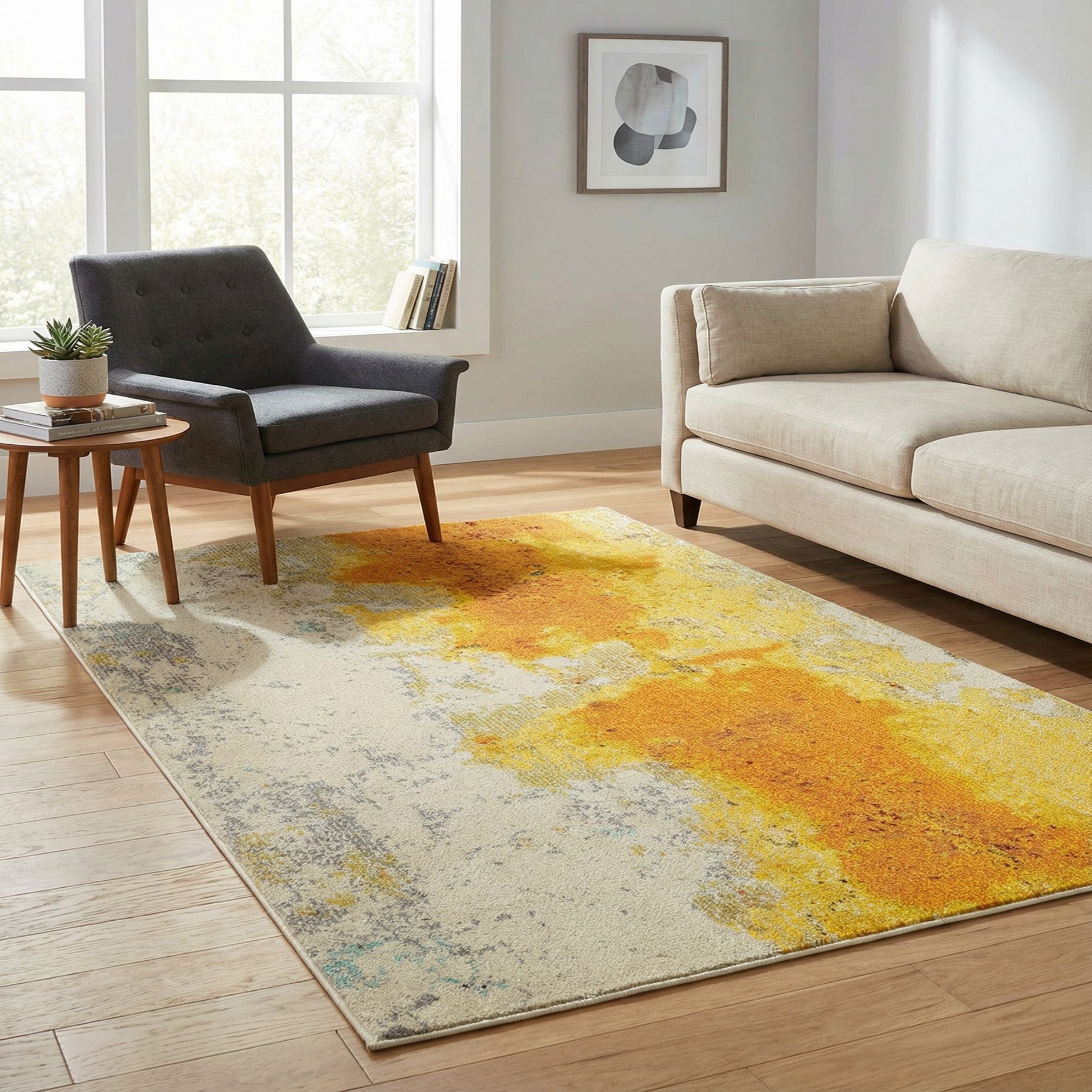 A painterly, abstract pattern washes across a bright yellow background, with bands of gold and deeper orange-gold forming a vertical sweep through the center. Soft gray and beige mottling balances the composition, creating a weathered, layered look that reads like a contemporary art piece. The color transitions feel intentional and measured, giving the rug a lively yet grounded presence.