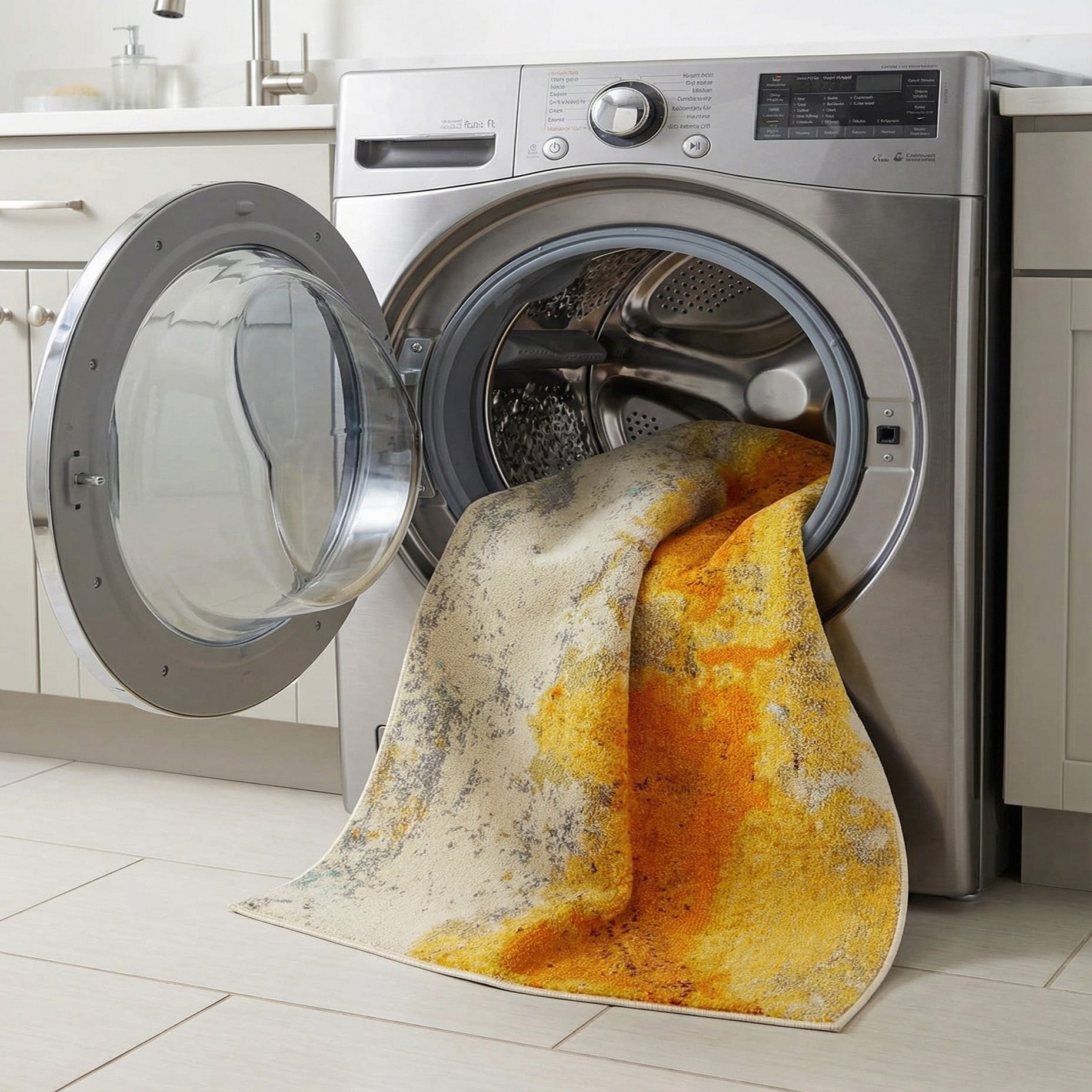A 3x5 rectangular modern abstract rug featuring bold yellow and gold brushstroke patterns over a light beige and gray background, ideal for a kitchen or entryway.
