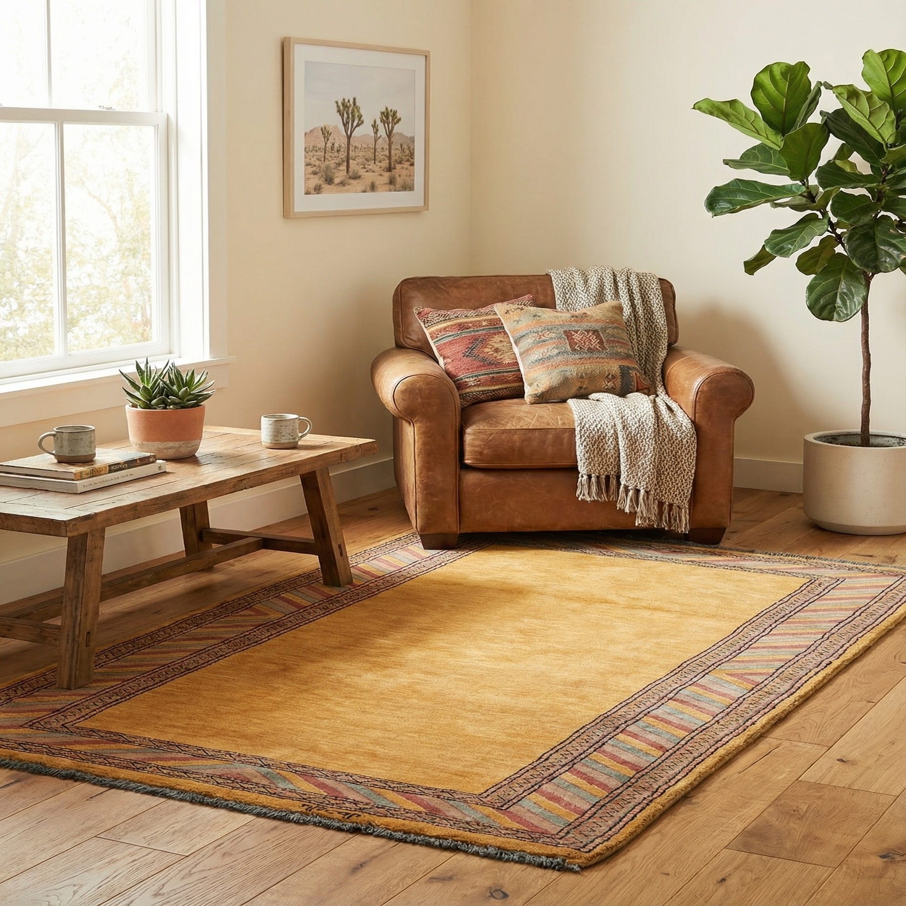 A 3x5 rectangular yellow wool rug with a modern oriental design, featuring a striped border in red, grey, and gold.