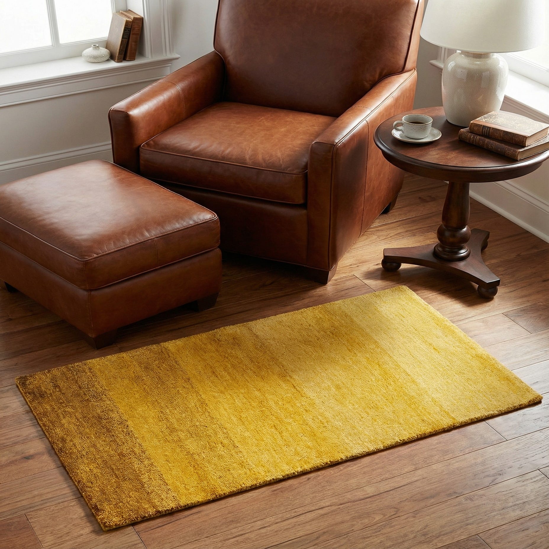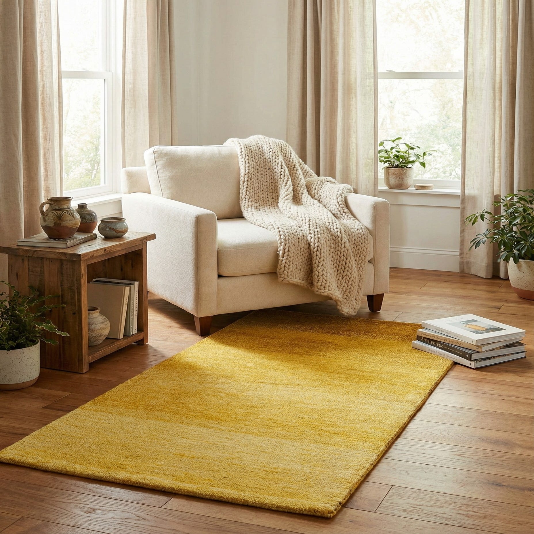 Primary color is Yellow. Colors in this rug include: Yellow, Brown, Terracotta, Gold.