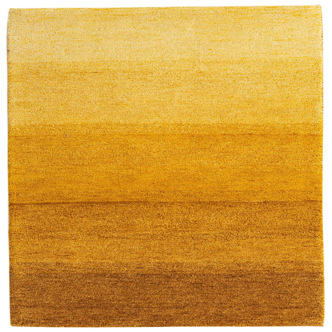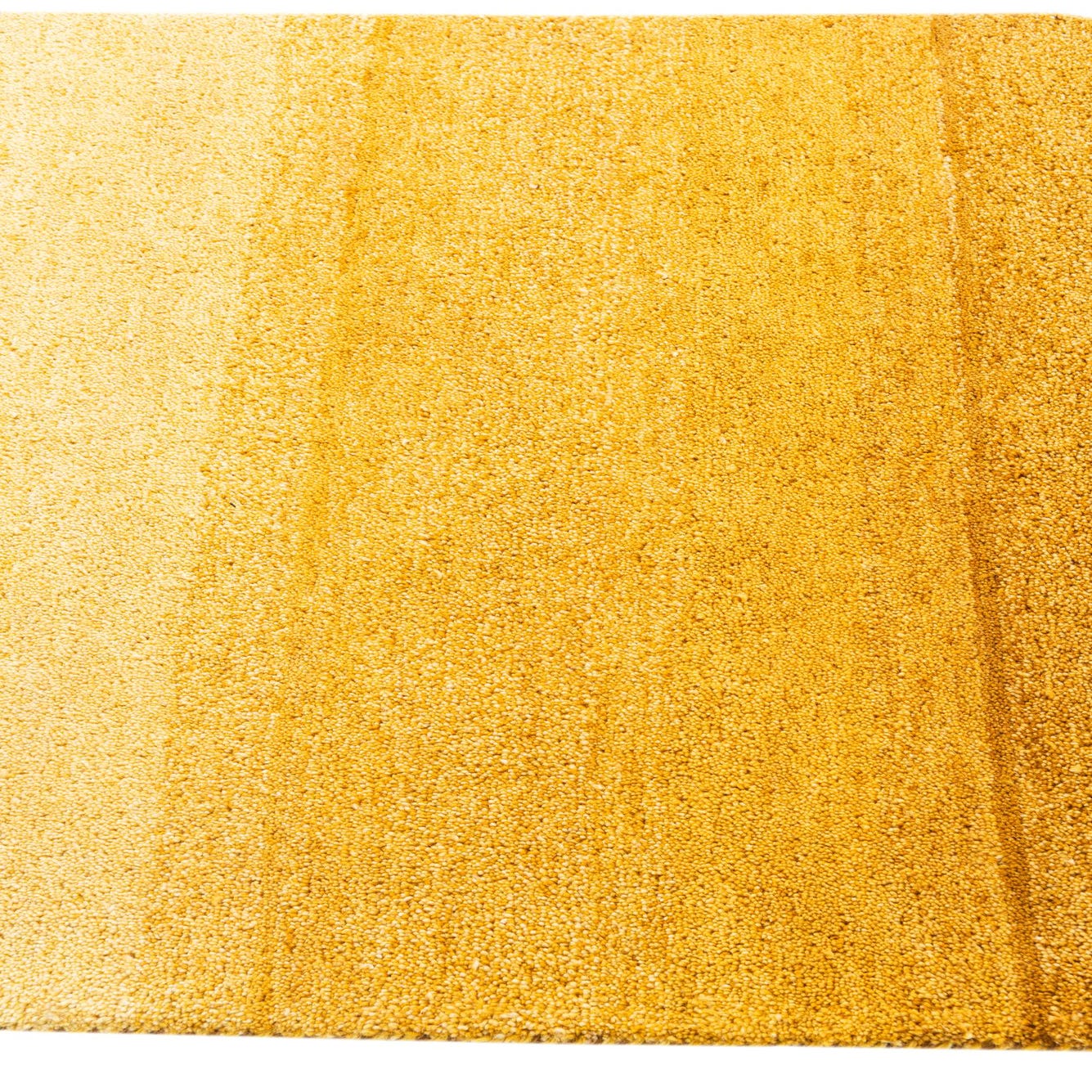 A 3x5 rectangular Kashkuli Gabbeh wool rug featuring a modern ombre design in varying shades of yellow and gold.