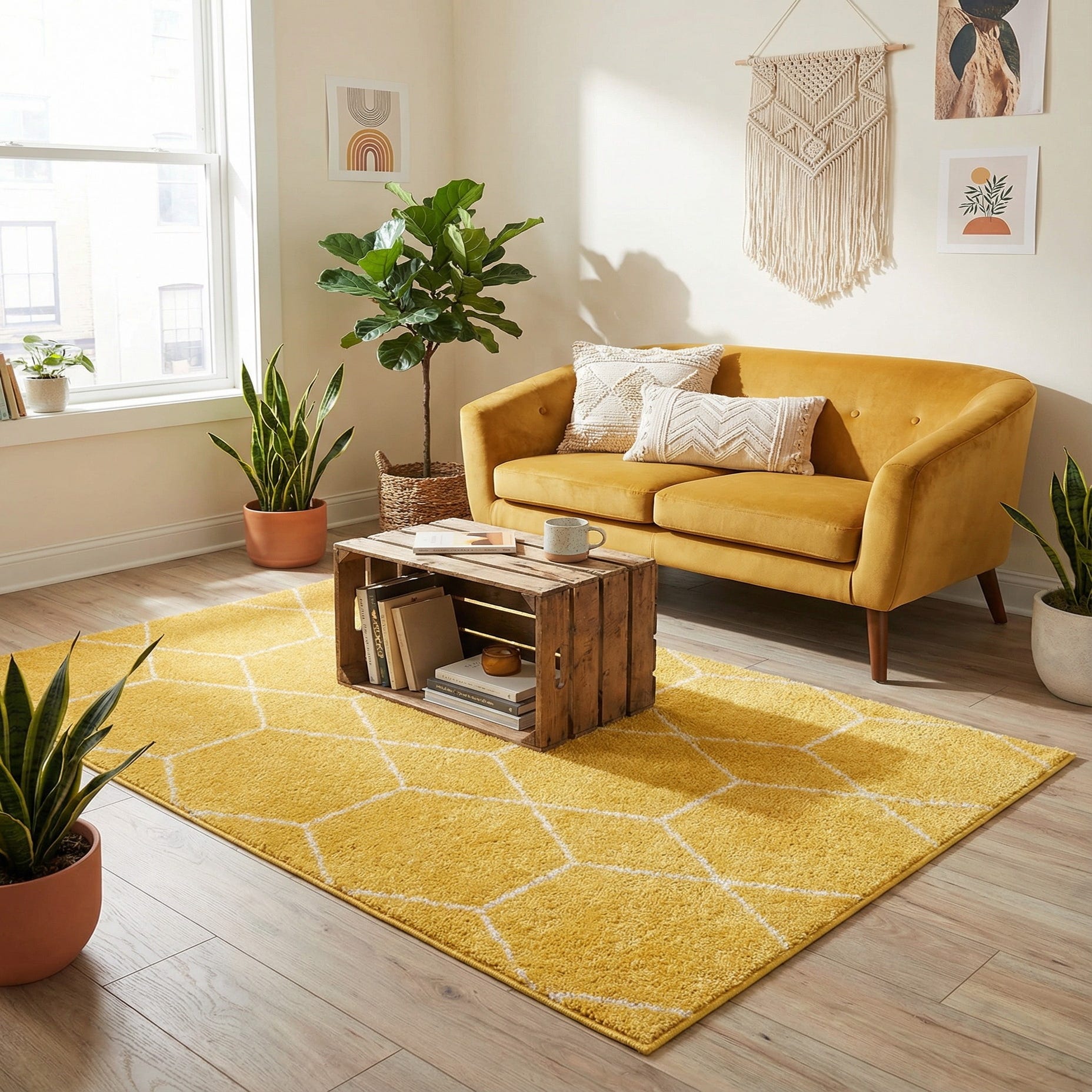 A sunny yellow ground is patterned with a crisp ivory hexagonal lattice that recalls a modern honeycomb motif. The geometric lines provide structure without heaviness, while the warm yellow field brings a bright, inviting presence to a room. Machine-made from 100% polypropylene, the rug has a soft, dense pile that feels plush underfoot; the ivory pattern sits as a slightly textured outline that adds gentle dimensionality to the surface.