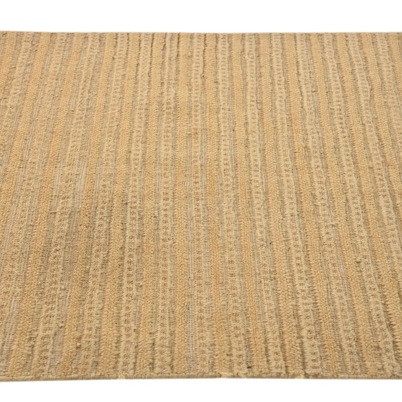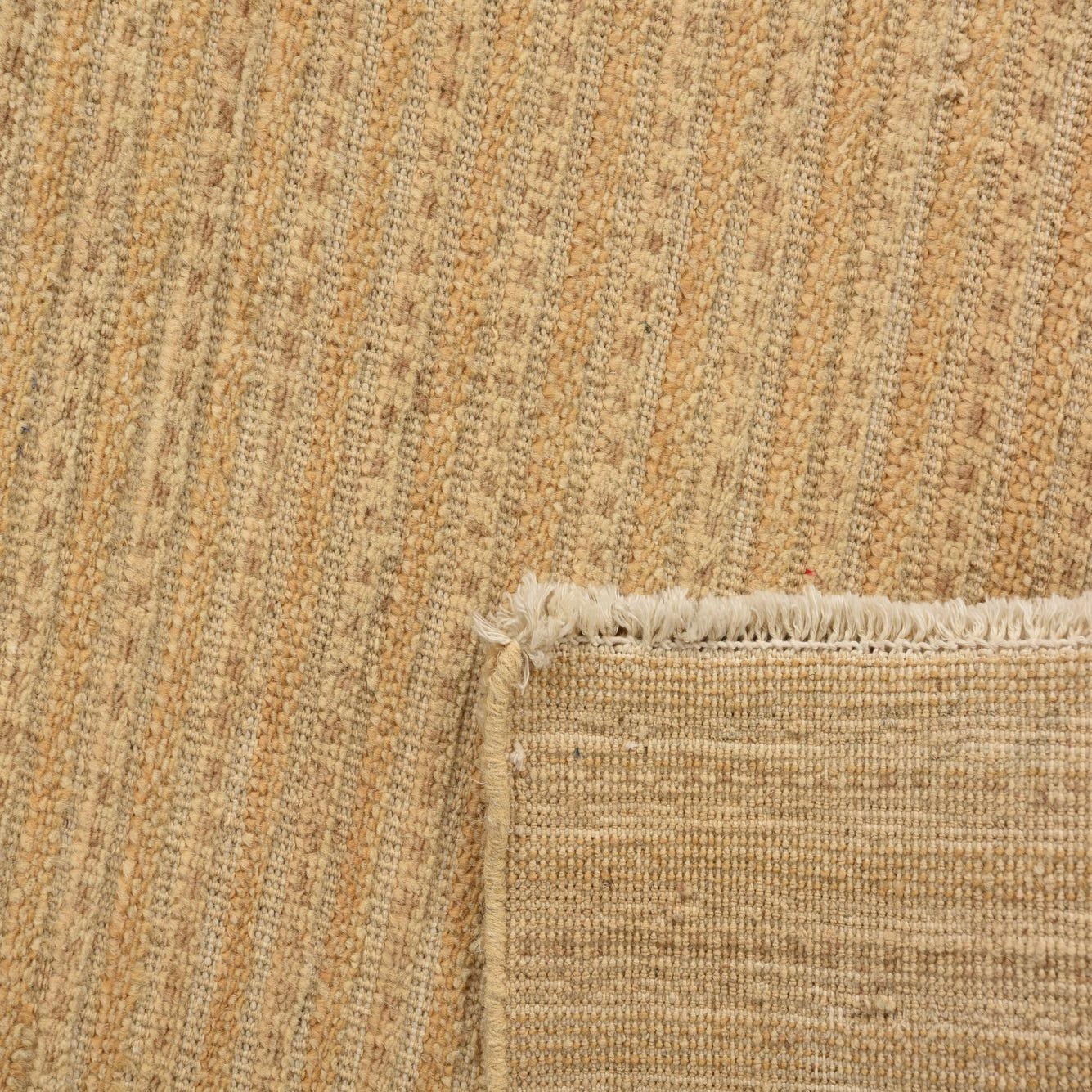 The design of the rug is distinguished by its simple horizontal striping, which provides both visual interest and a sense of depth to the rug's otherwise minimalist aesthetic. The presence of fringe adds a classic detail that complements the rug's traditional craftsmanship.