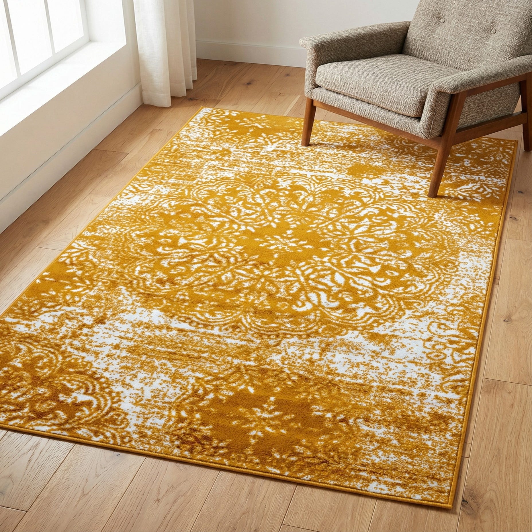 A distressed medallion design in soft ivory rests against a warm yellow field, creating a vintage-inspired look with modern clarity. Ornate floral flourishes and faded banding are artfully worn back to reveal scattered speckling across the surface, giving the rug a lived-in, layered appearance. Machine made from 100% polypropylene, the low pile feels smooth and slightly plush underfoot, with enough texture to read the pattern while remaining easy to place under furniture.