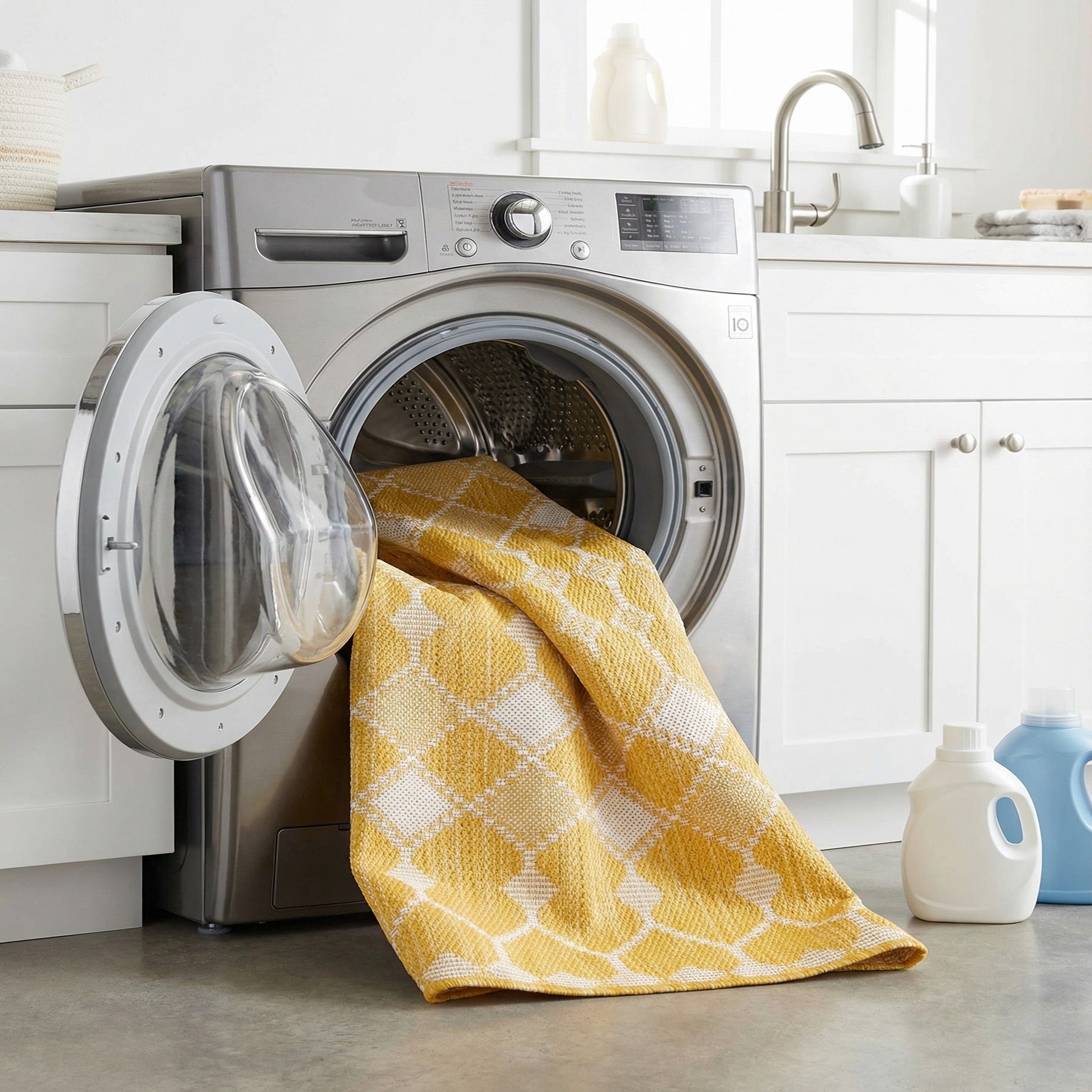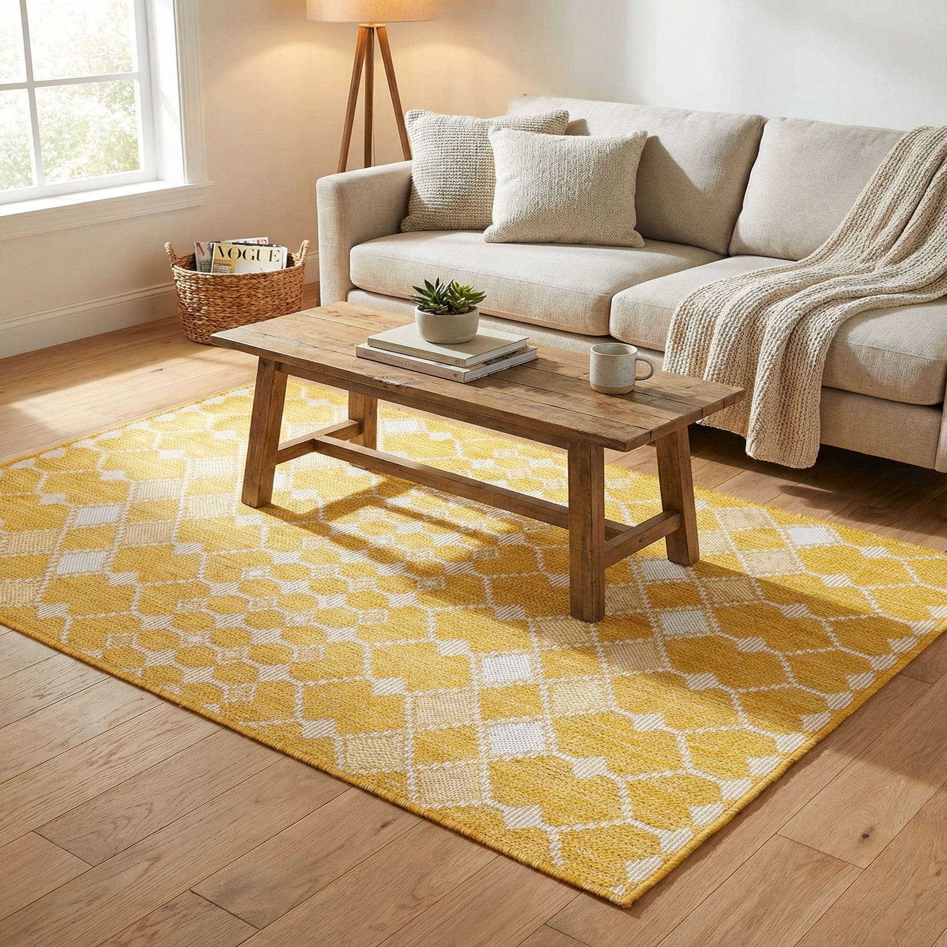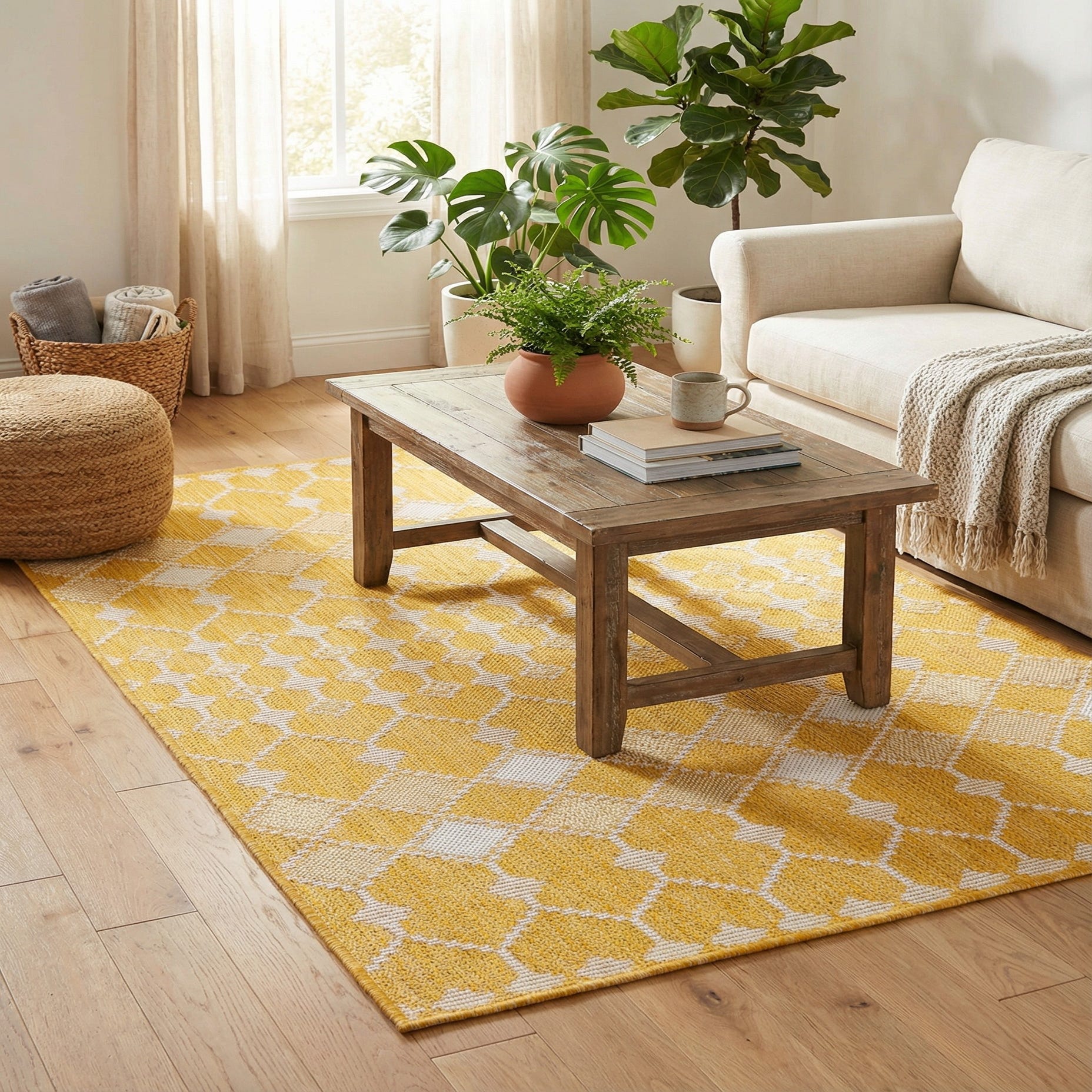 A 3x5 rectangular yellow and white flatweave rug with a modern trellis pattern, suitable for indoor or outdoor use.