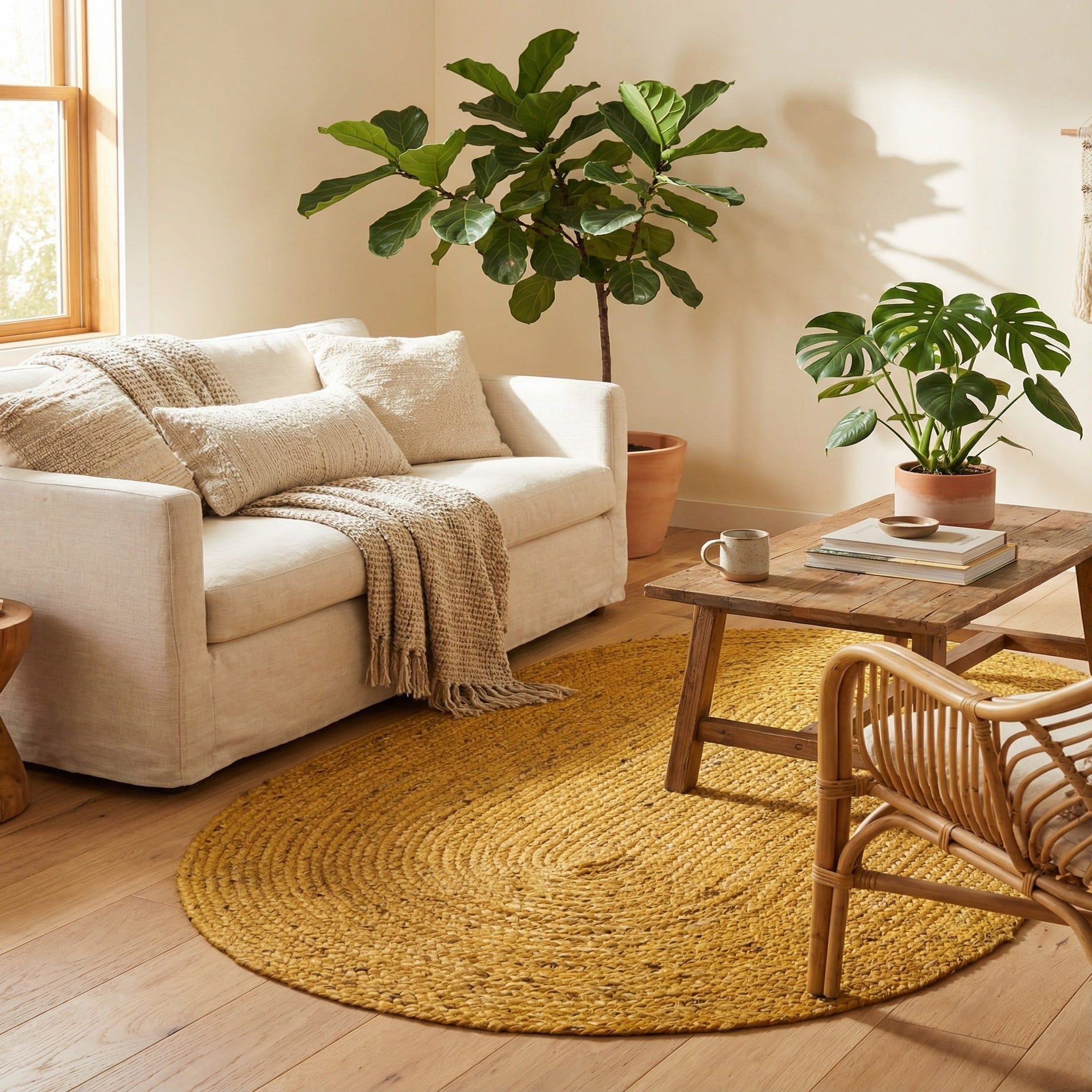 This piece fits a range of interiors — pair it with light woods and white trim for a relaxed coastal feel, layer it into a bohemian or farmhouse scheme with woven baskets and linen textiles, or use it to bring warmth to a sunroom, entryway, or breakfast nook. The oval shape and natural texture make it an easy way to introduce color and grounding texture without dominating the room.