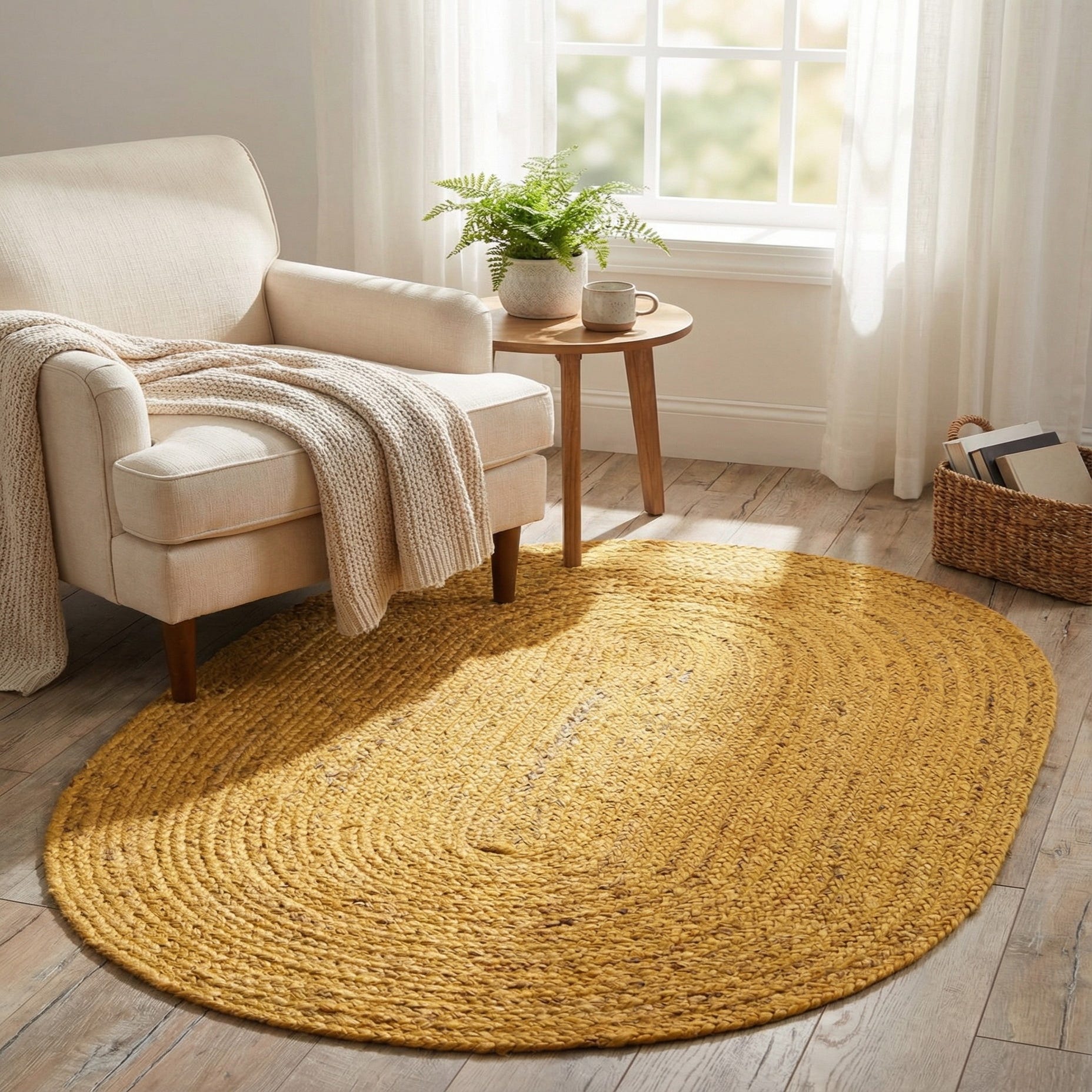 Hand-braided from 100% jute, this oval rug features concentric braided rows that form a clean, organic pattern. The background color is yellow, a warm golden tone threaded with subtle darker flecks that add depth and visual interest. The braided construction yields a low-profile surface with a firm, slightly textured hand that highlights the natural character of the fiber.