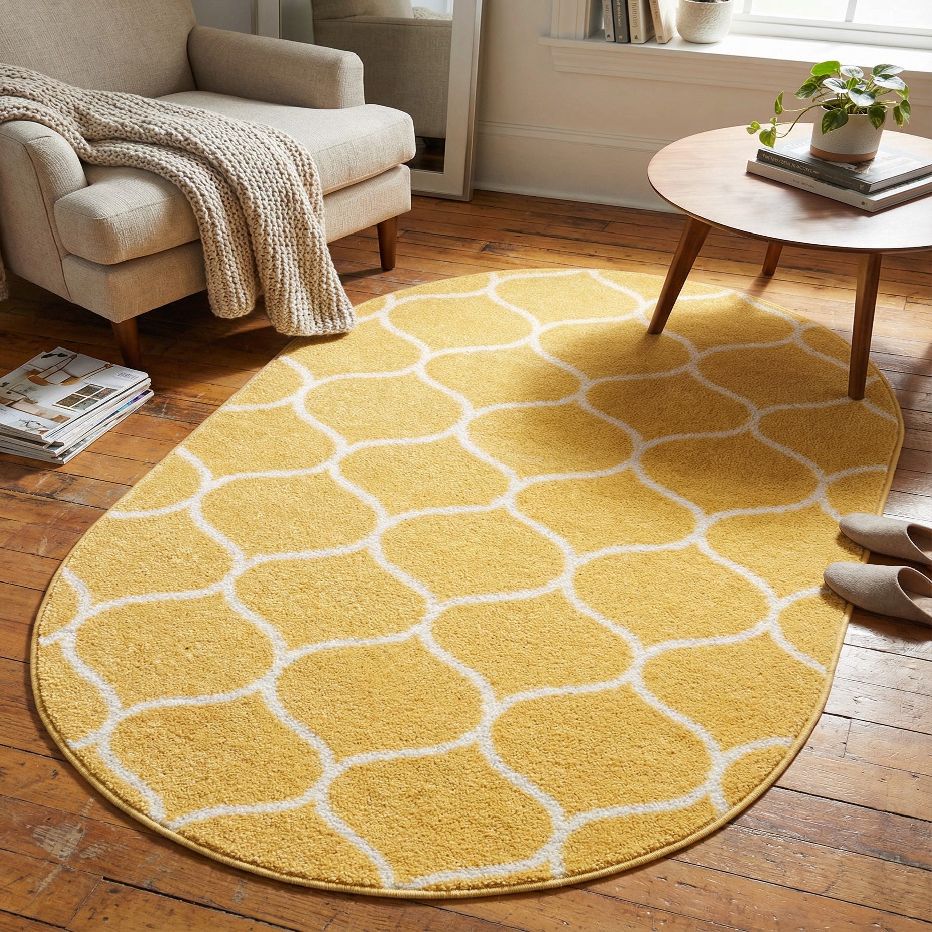 A warm yellow ground provides an inviting backdrop for a repeating ivory lattice of rounded, lantern-like motifs. The pattern blends a contemporary trellis with a subtle nod to traditional shapes, creating a balanced, modern-classic look. Machine-made from 100% polypropylene, the low, dense pile feels soft underfoot while maintaining crisp pattern definition and a slight, tactile texture.