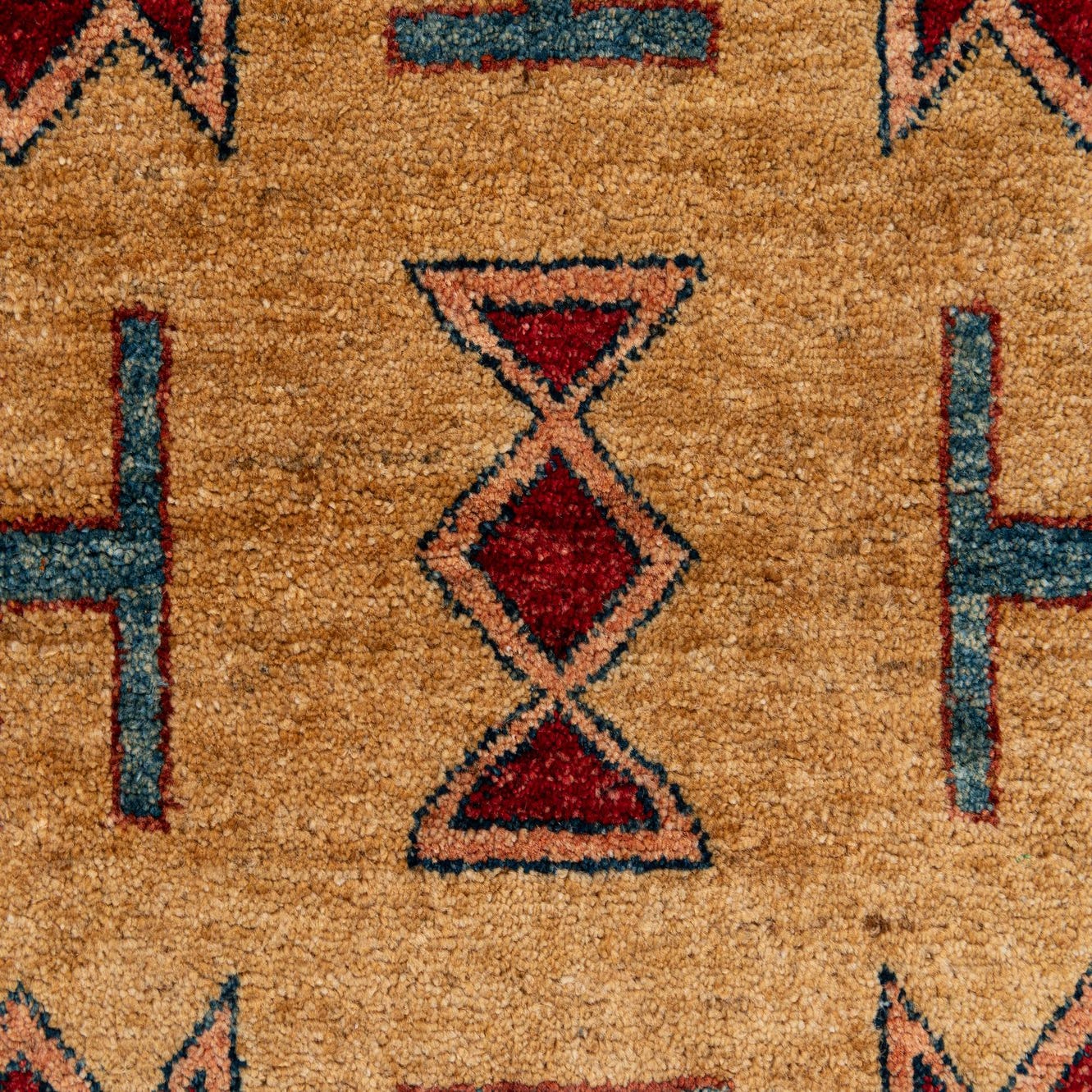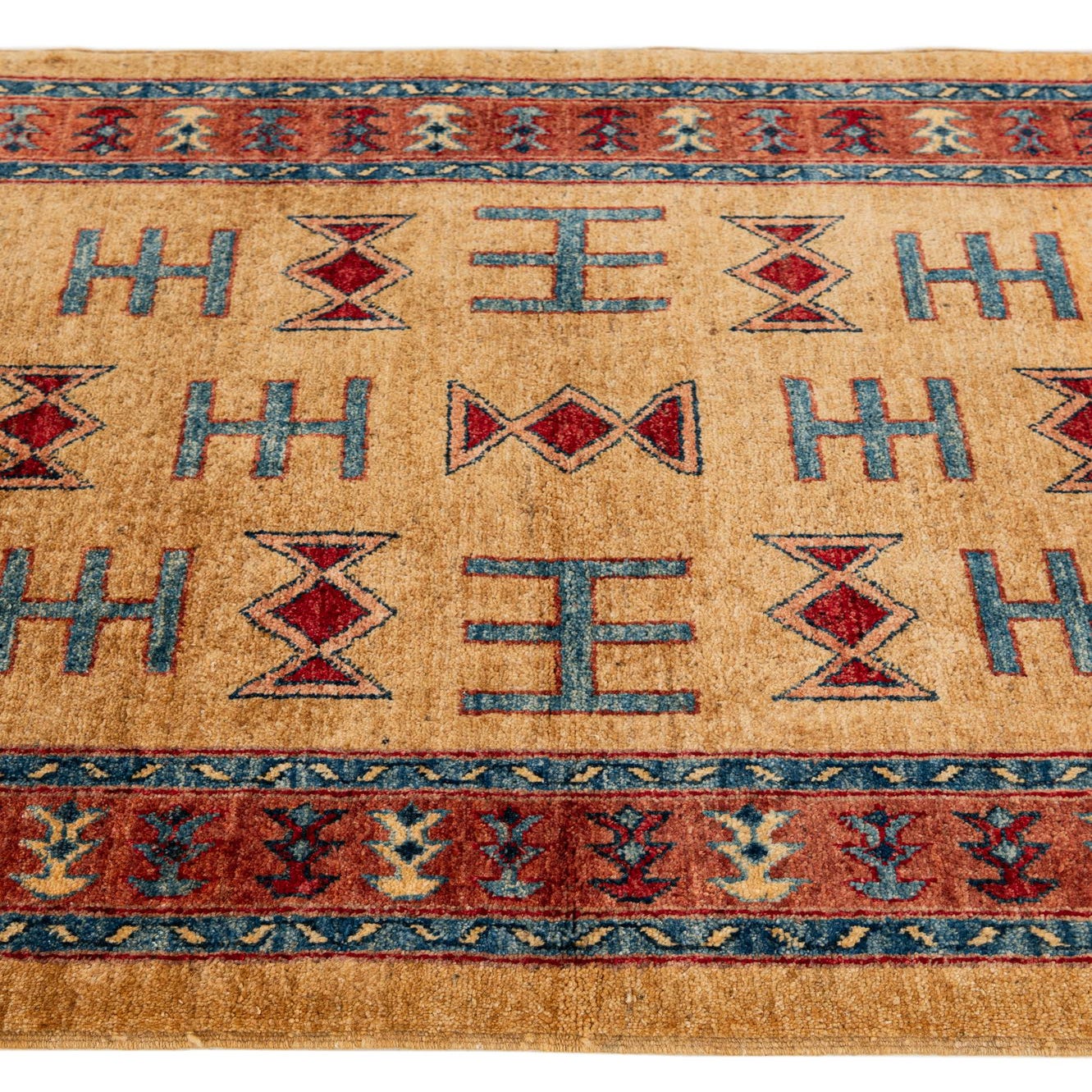 A 3x5 rectangular Ziegler rug with a gold field, red border, and blue and red geometric patterns.