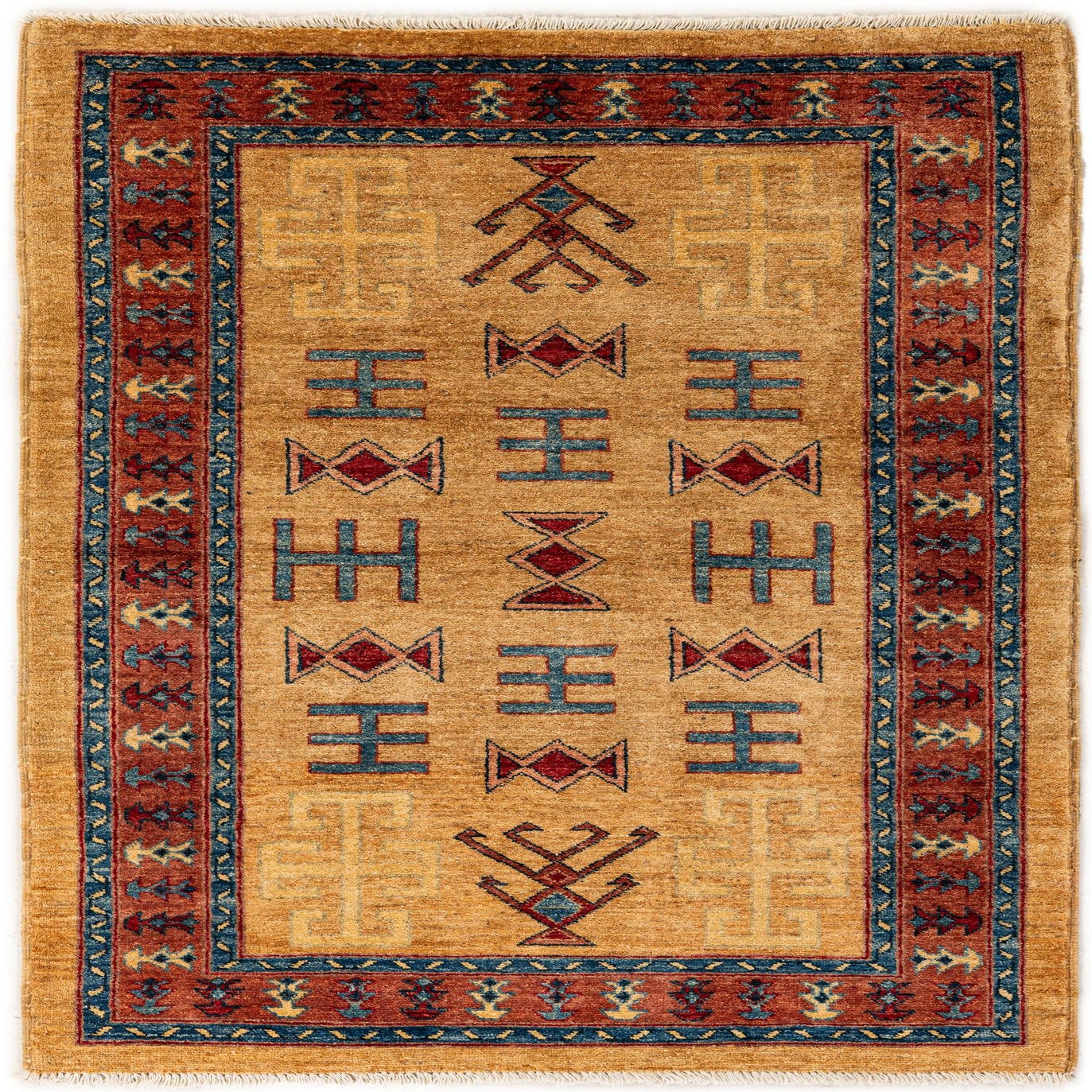 Primary color is Yellow. Colors in this rug include: Yellow, Blue, Brown, Rust Red, Light Blue.