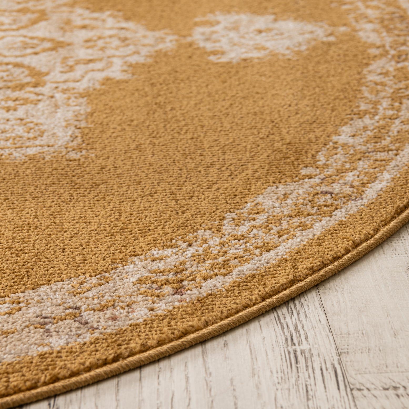 A warm yellow ground sets the stage for an ornate, medallion-style pattern worked in ivory, beige, brown and touches of gold. The central motif and surrounding border have a gently distressed finish that gives the design a lived-in character without losing detail. Machine made of 100% polypropylene, the rug has a low-profile pile that feels smooth underfoot and keeps the pattern sharply defined while offering a soft hand.