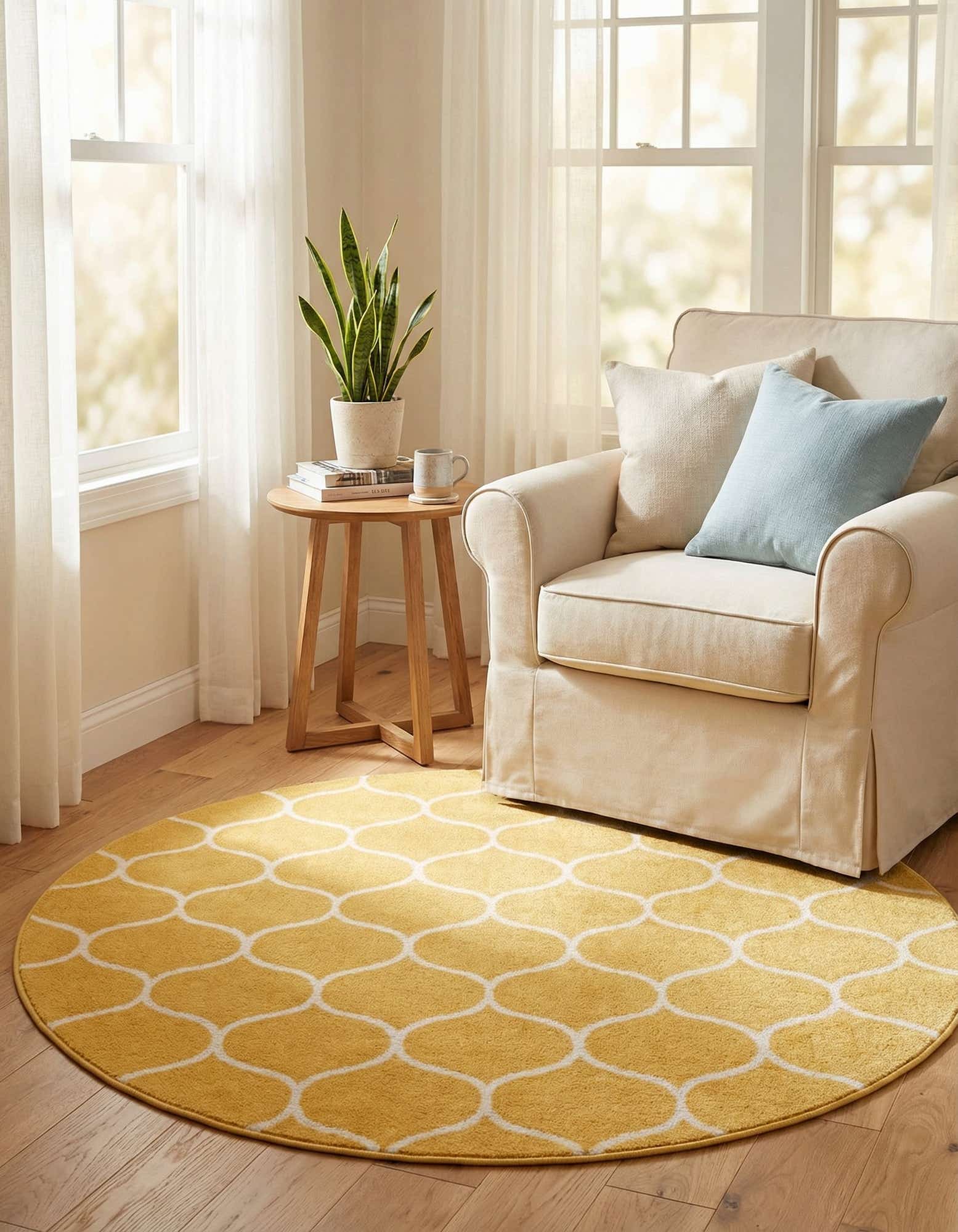 A sunny yellow ground is crossed by an ivory lattice of rounded trellis shapes, forming a modern yet approachable geometric pattern. The design reads transitional — clean and contemporary with a soft, decorative curve — and the round silhouette enhances its casual, inviting presence. Machine-made from 100% polypropylene, the rug has a low, plush pile with a velvety hand that feels soft underfoot and shows a subtle nap that catches the light.