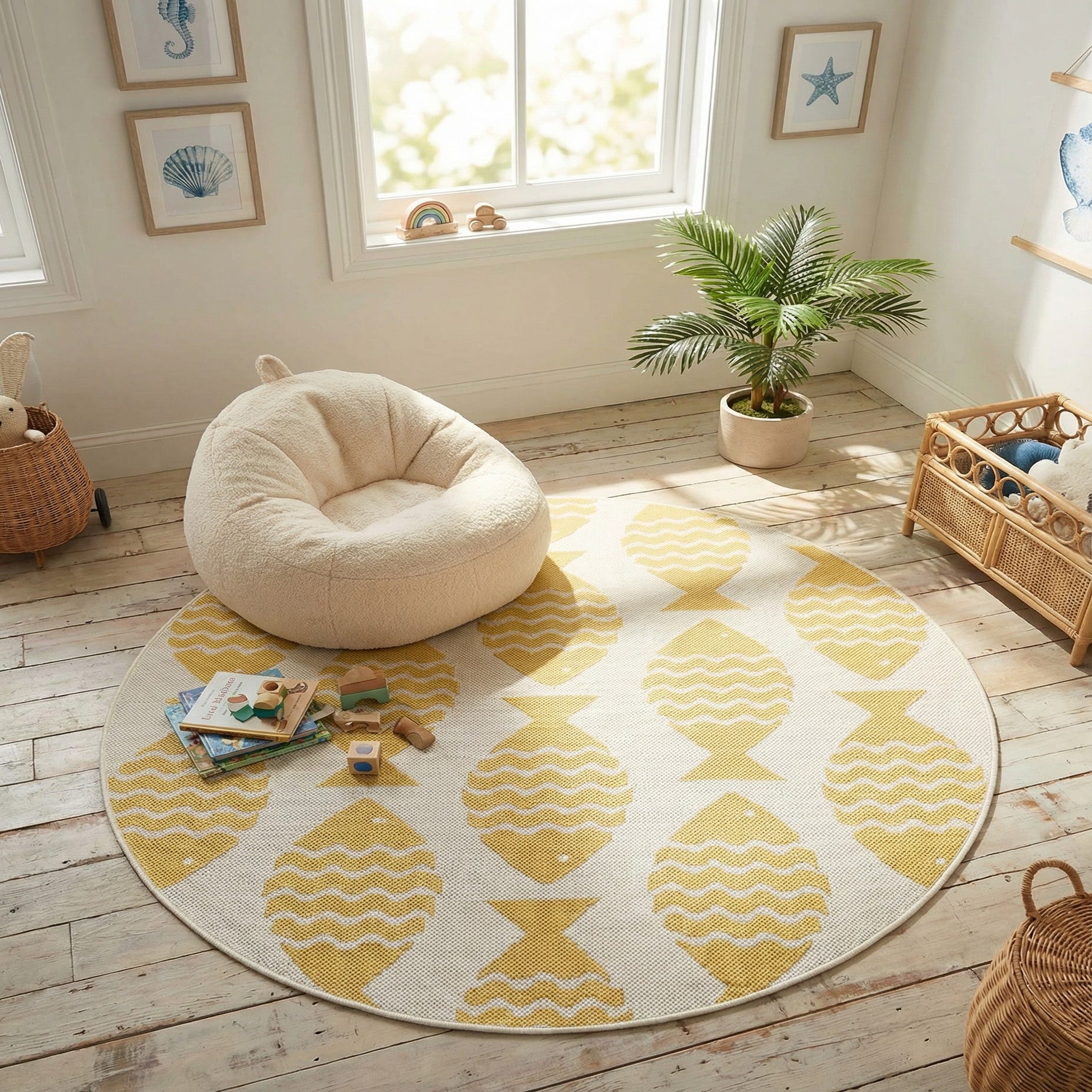 Round indoor/outdoor rug with a playful pattern of yellow fish on a white background, perfect for a patio.