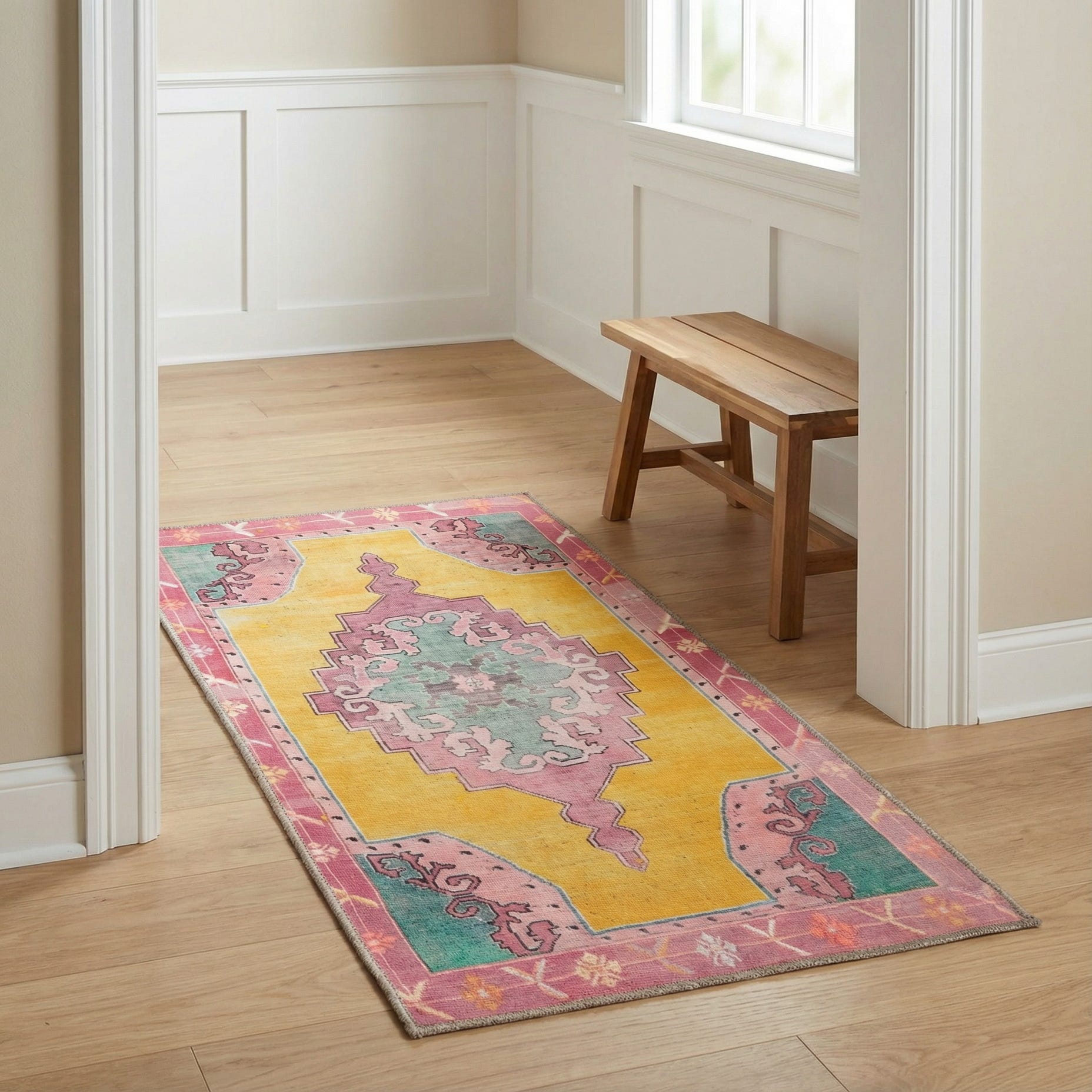 Machine-made from 100% polyester, the rug has a smooth, low-profile pile that feels soft underfoot and holds color with a subtle sheen. Use it as a hallway or entry runner, alongside a bed, or in a narrow kitchen or gallery space to introduce color and pattern without overwhelming the room. It pairs well with warm wood finishes, rattan or woven textures, and mixed-metal accents, and fits nicely in eclectic, bohemian, or modern-traditional interiors.