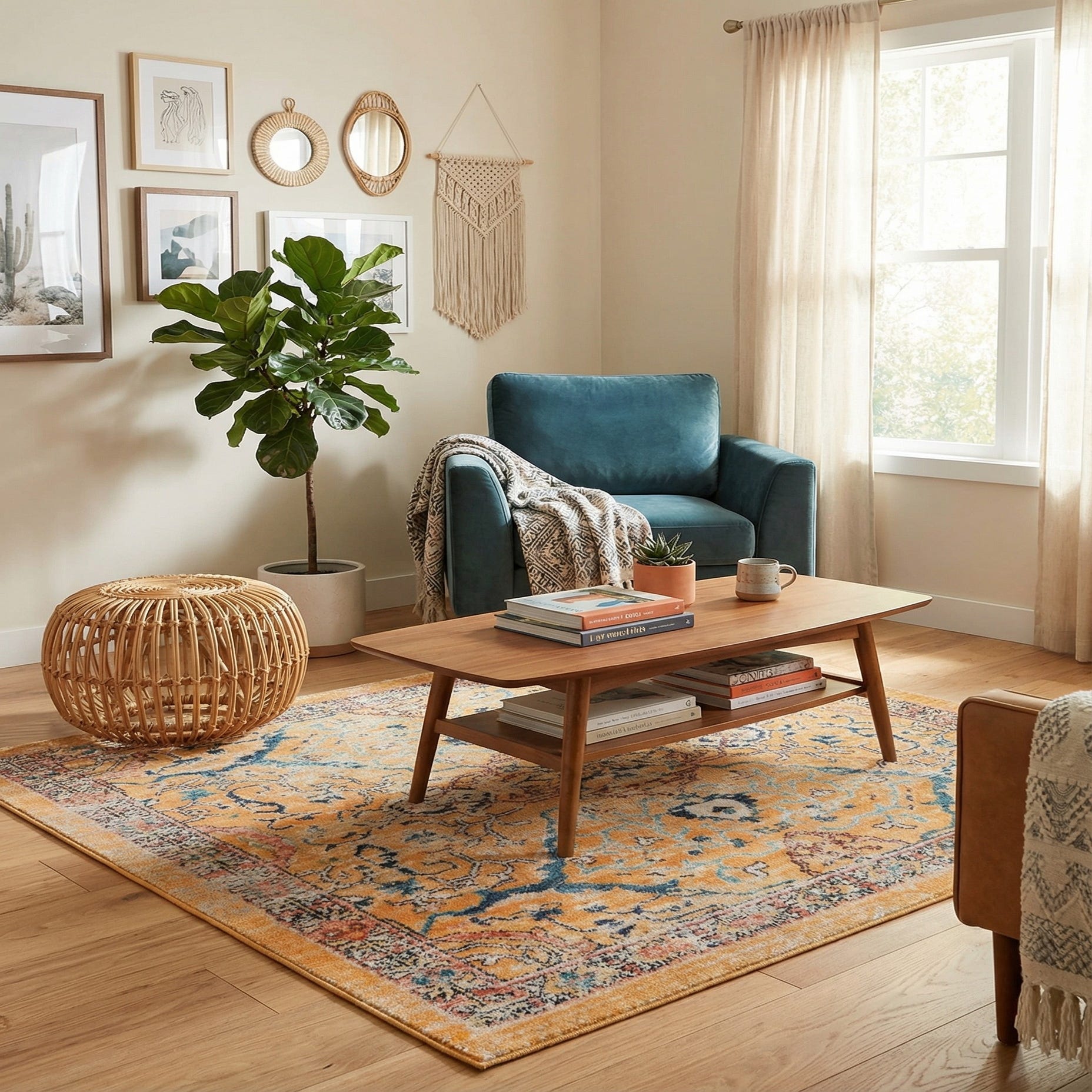 Machine-made polypropylene creates a low, slightly plush pile with fine pattern definition and gentle variations in height that you can feel when you run your hand across it. Place this piece in a small living room under a coffee table, in an entryway, at the foot of a bed or in a cozy home office; it pairs especially well with warm wood furniture, neutral linen upholstery and navy or rust accent pieces. The palette and vintage character suit transitional, eclectic and traditional interiors looking for a cheerful, grounded focal point.