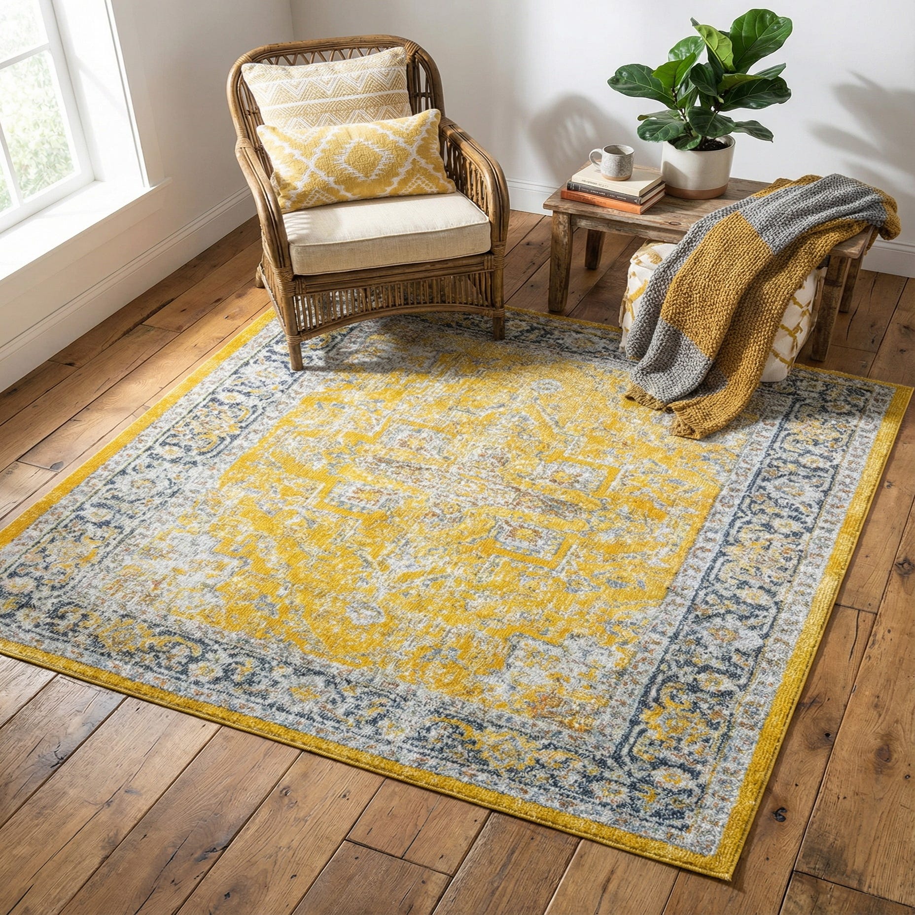 A warm yellow field sets the stage for a softly distressed medallion motif framed by a decorative border. Intricate scrollwork in gray and ivory weaves through the center, while accents of blue, light blue and orange highlight the design and add dimension. The overall look is vintage-inspired with a gently faded finish that gives the pattern an approachable, lived-in character.