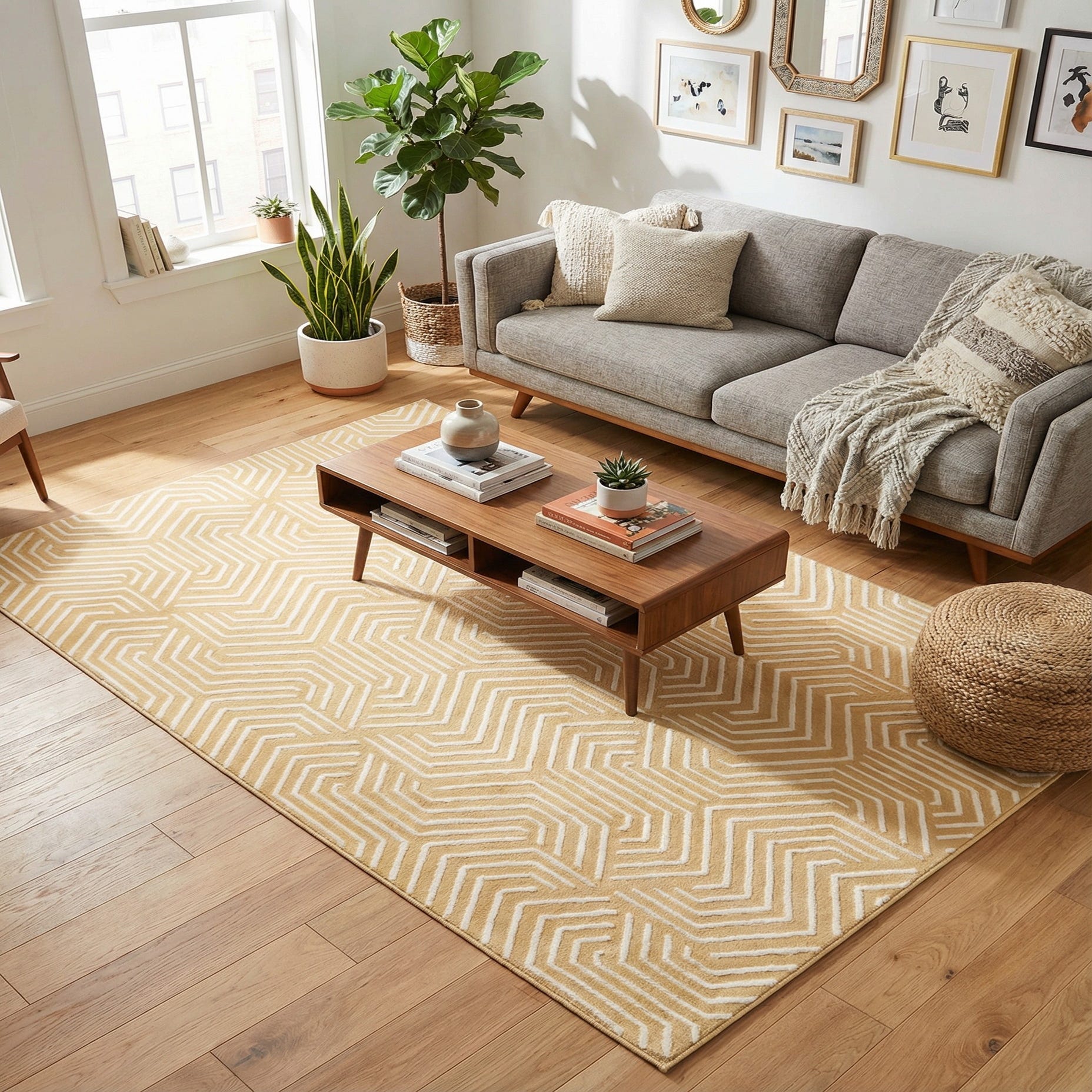 This rug works well as an anchor in a casual living room or a compact seating area, and it can also brighten an entry, bedroom, or home office without overwhelming the space. Pair it with light wood furniture and neutral textiles for a Scandinavian vibe, or combine it with navy and brass accents for a more mid-century modern look. The bold pattern and warm color make it a versatile choice when you want to introduce pattern and energy while keeping the rest of the palette calm.