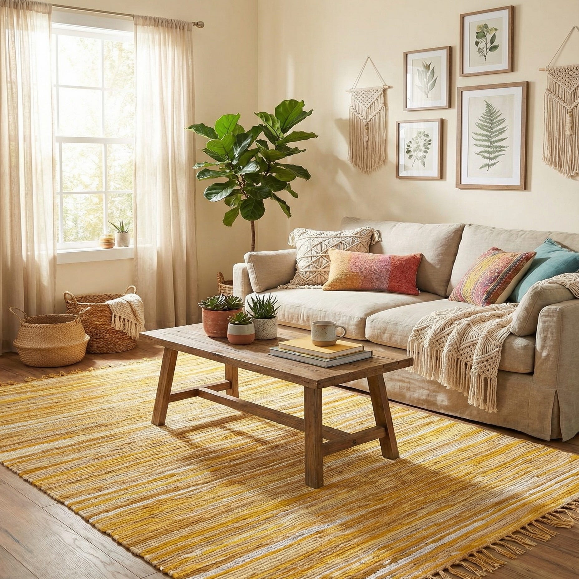 This rug works well in smaller spaces where texture and color can lift the room — place it in an entryway, kitchen, sunroom, or layered beneath a low coffee table. It pairs naturally with light wood tones, white or neutral upholstery, and woven accessories, and complements coastal, farmhouse, Scandinavian, and relaxed bohemian interiors.