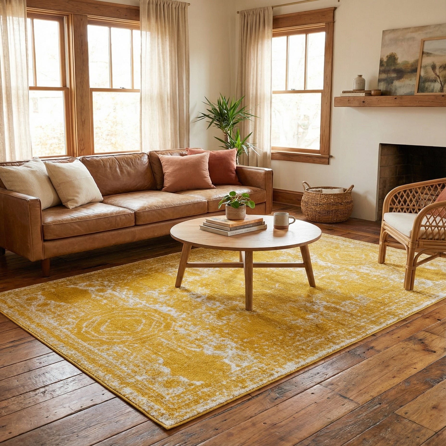 Machine-made from 100% polypropylene, the rug provides a consistent, even finish that layers easily into different interiors. It’s an inviting choice for brightening an entryway or hallway, anchoring a small seating nook, or adding a pop of color at the foot of a bed. Pair it with natural woods and muted neutrals for modern farmhouse or Scandinavian settings, or use it to warm mid-century and contemporary rooms where a touch of vintage character and sunny color is needed.