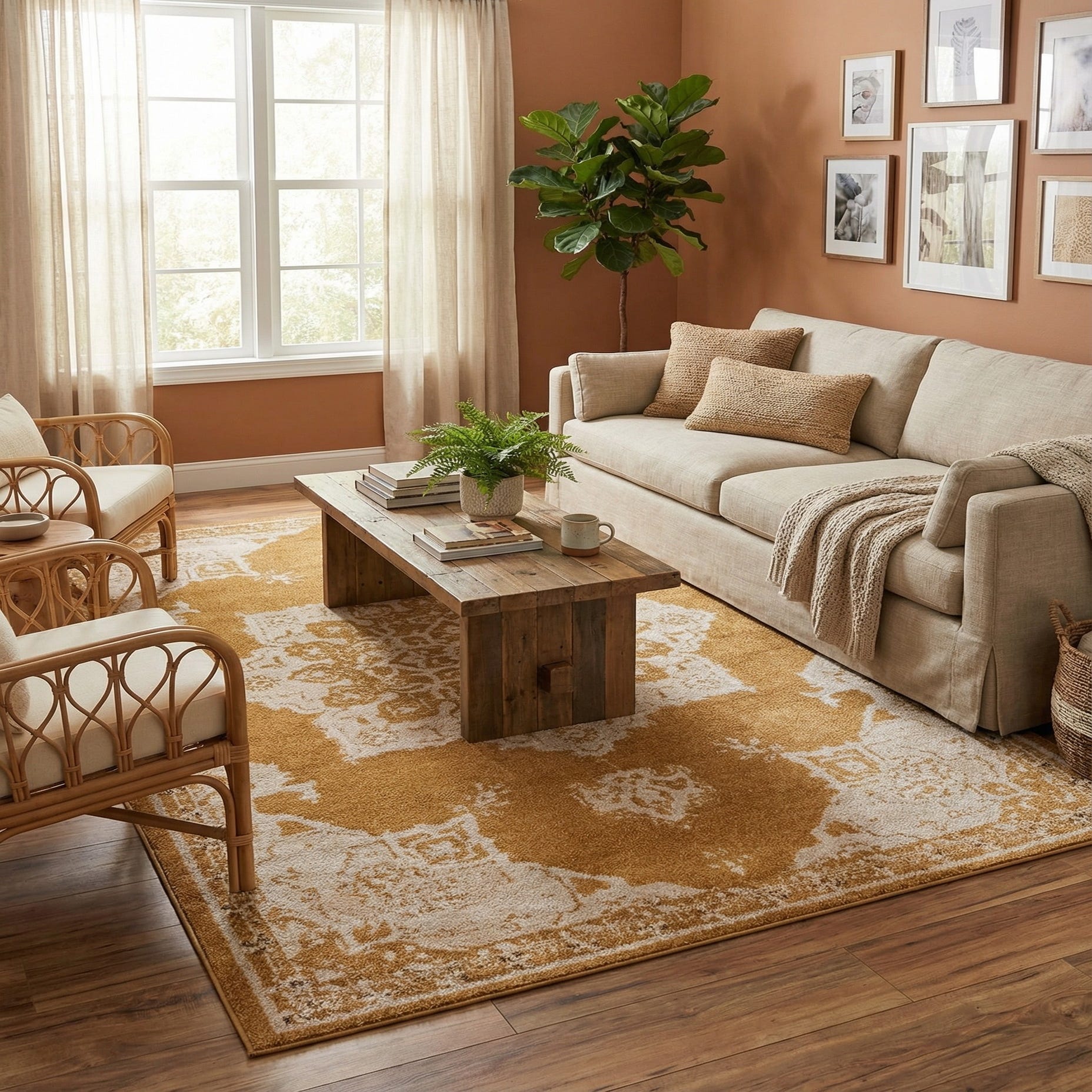 Machine-made from 100% polypropylene, the rug has a low, dense pile with a soft hand that holds the design crisply and provides a comfortable surface underfoot. It works well layered in a living room beneath a coffee table, anchored under a bed, or placed in an entry or reading nook to add warmth. Pair it with warm wood furniture, natural fibers like jute or linen, and brass or gold-toned accents for a cohesive look that blends traditional patterning with contemporary, casual interiors.