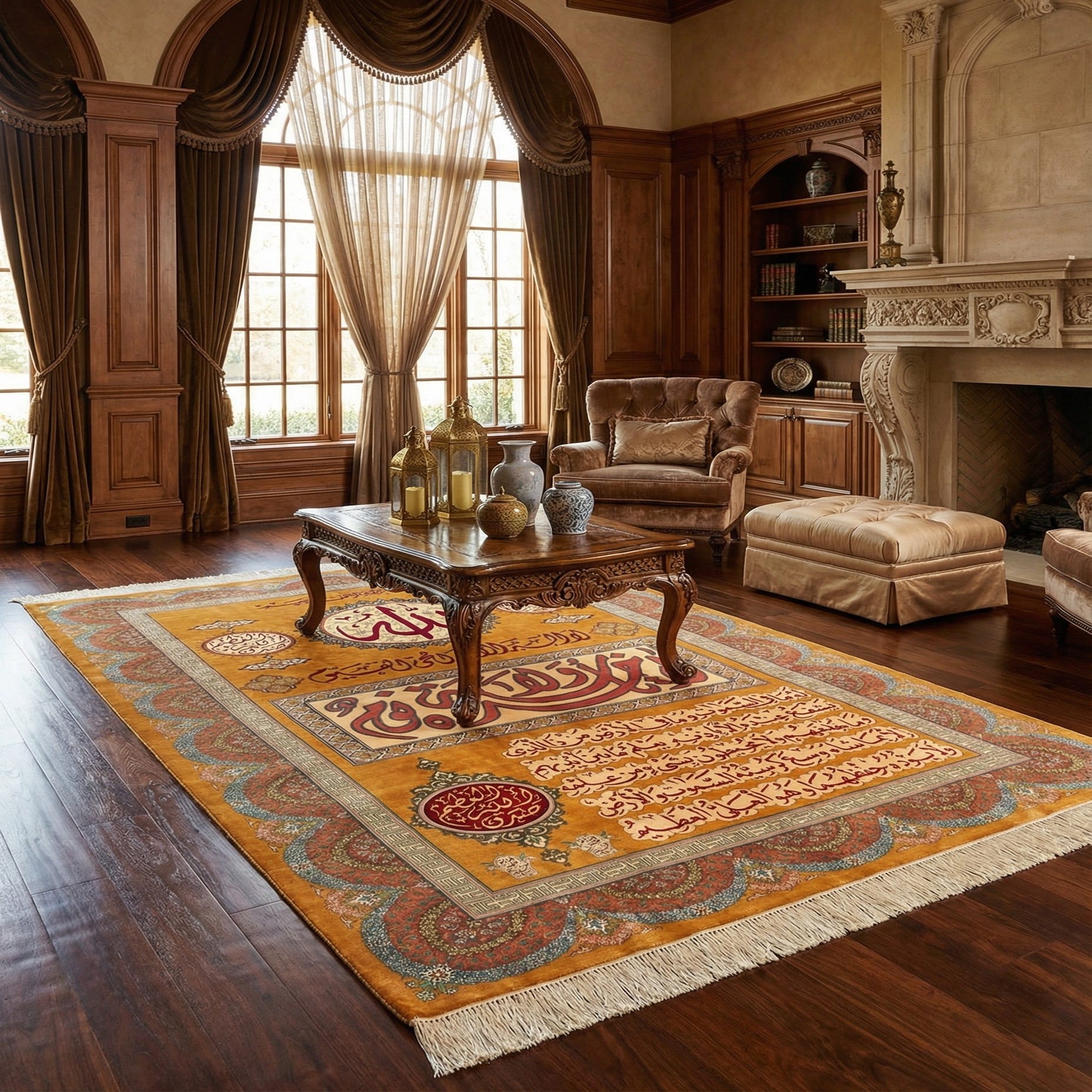 A 4x6 rectangular yellow Persian silk rug featuring intricate red and blue borders and Arabic calligraphy.