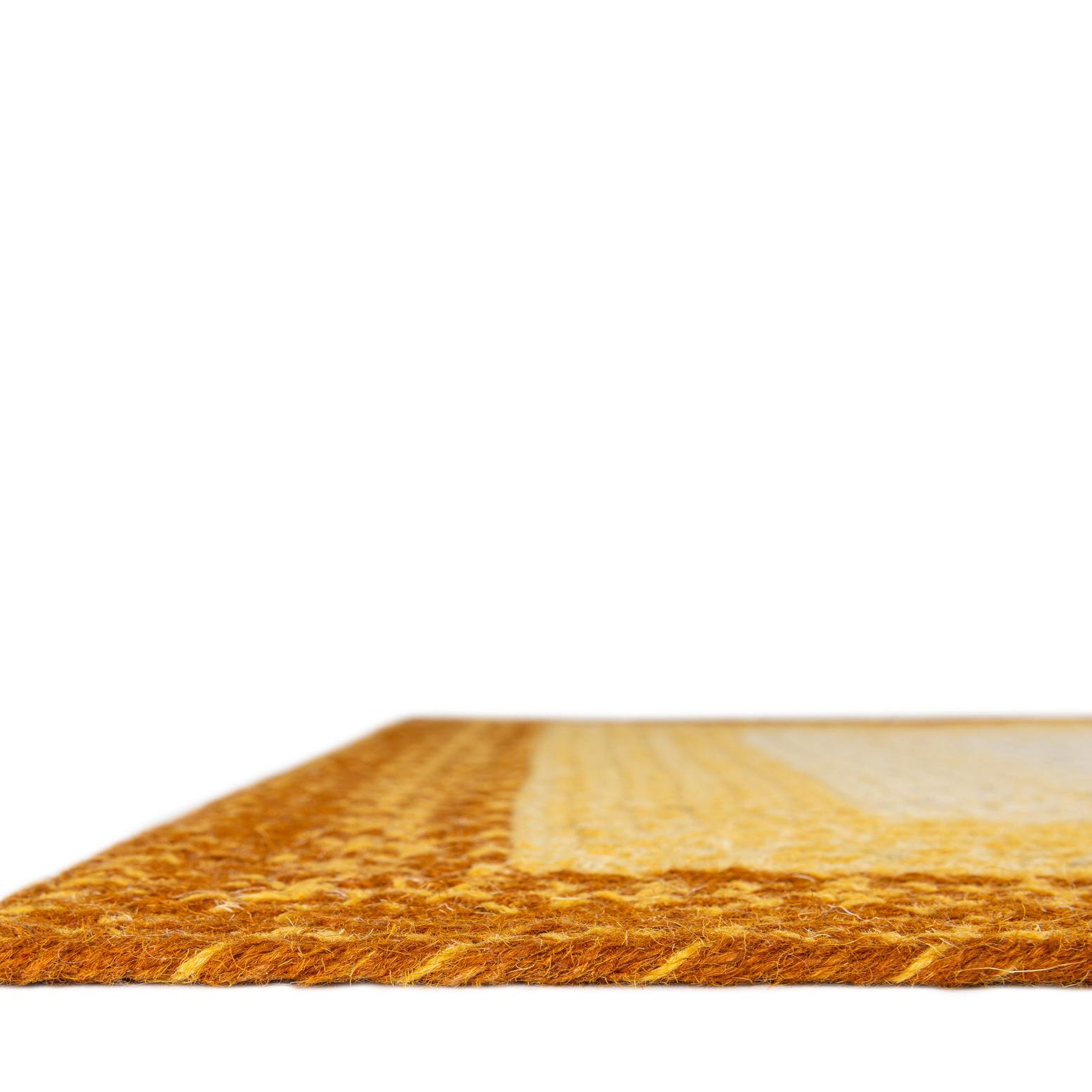 Hand-braided from 100% wool, this rug presents a series of concentric bands that move from a soft, creamy center outward through pale and sunny yellows to a warm golden-brown border. The yellow background brings an overall sunny, layered effect while the braided construction creates a subtle, rope-like texture that you can both see and feel—each coil sits slightly raised, giving a tactile, dimensional surface that reads warm and grounded underfoot.