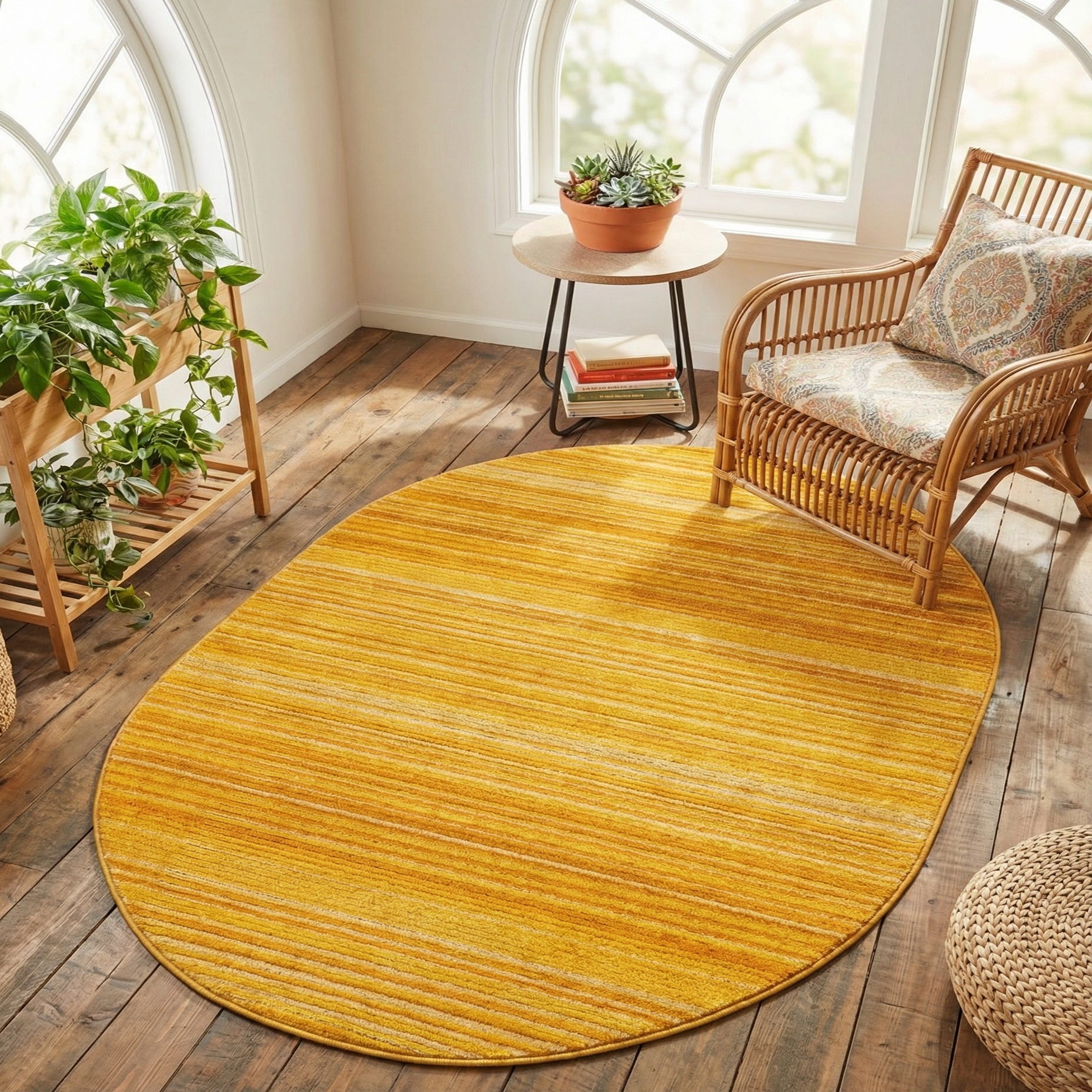 A 4' 0 x 6' 3 oval yellow area rug with a modern textured stripe pattern, suitable for indoor spaces.