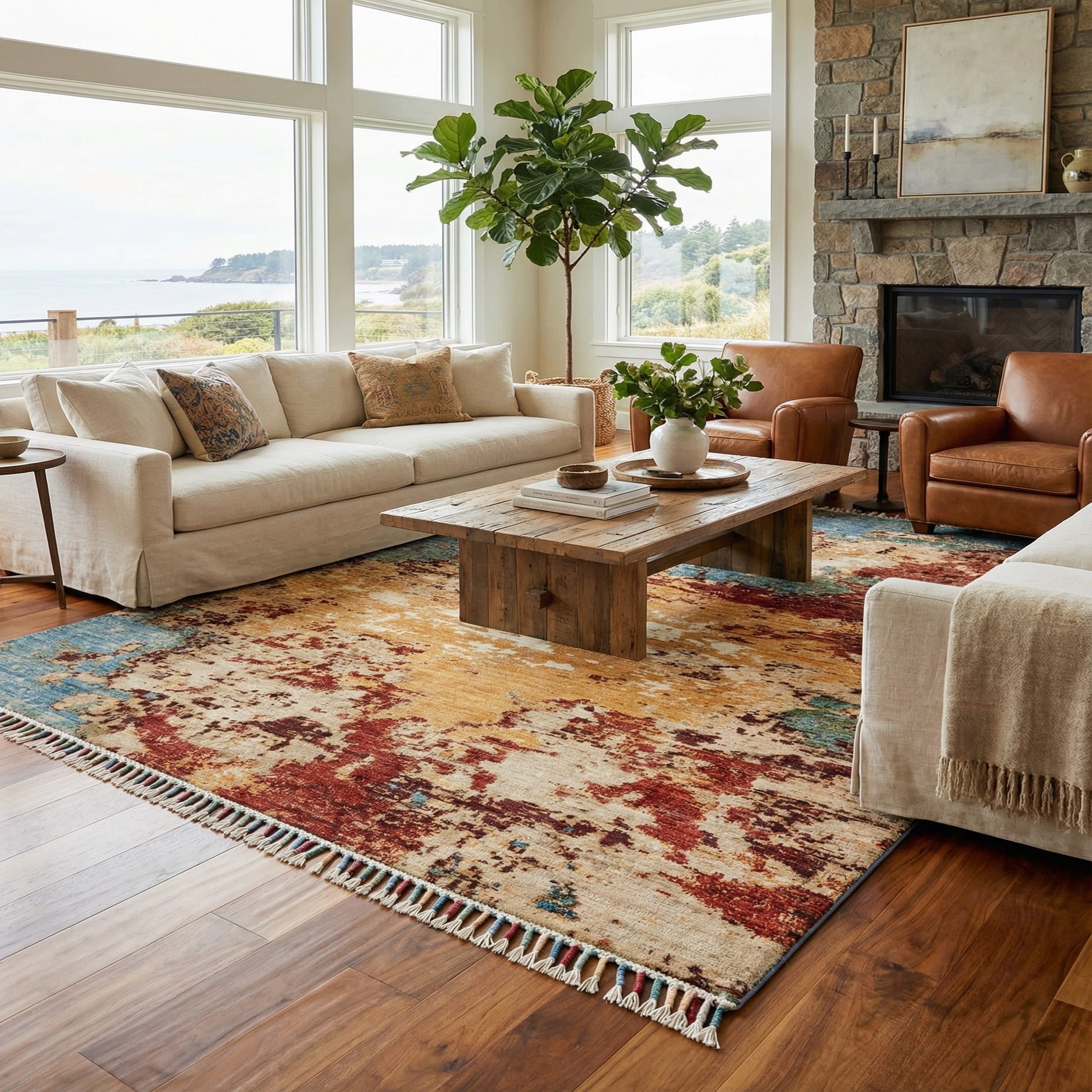 A 4x6 rectangular Rubin Persian rug featuring an abstract distressed pattern in yellows, golds, blues, and reds, with short fringe.