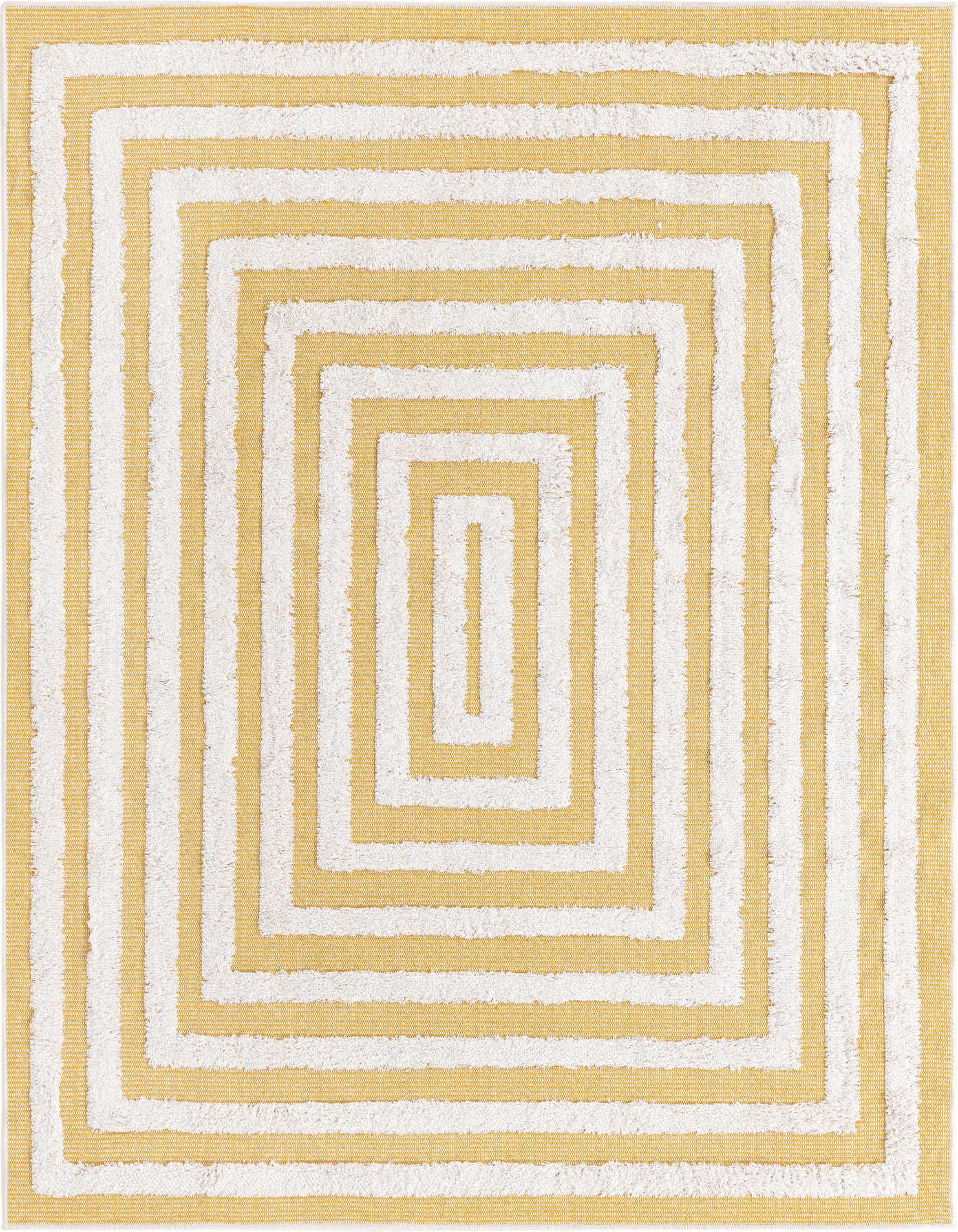 The Sabrina Soto Casa Collection presents a tastefully designed 4x6 rug, machine-woven from 100% cotton. This rug showcases a striking yellow background with ivory accents, creating a bold contrast in its pattern. The design features a series of concentric rectangles that offer a sense of depth and movement, while their clean lines lend a modern geometric aesthetic.