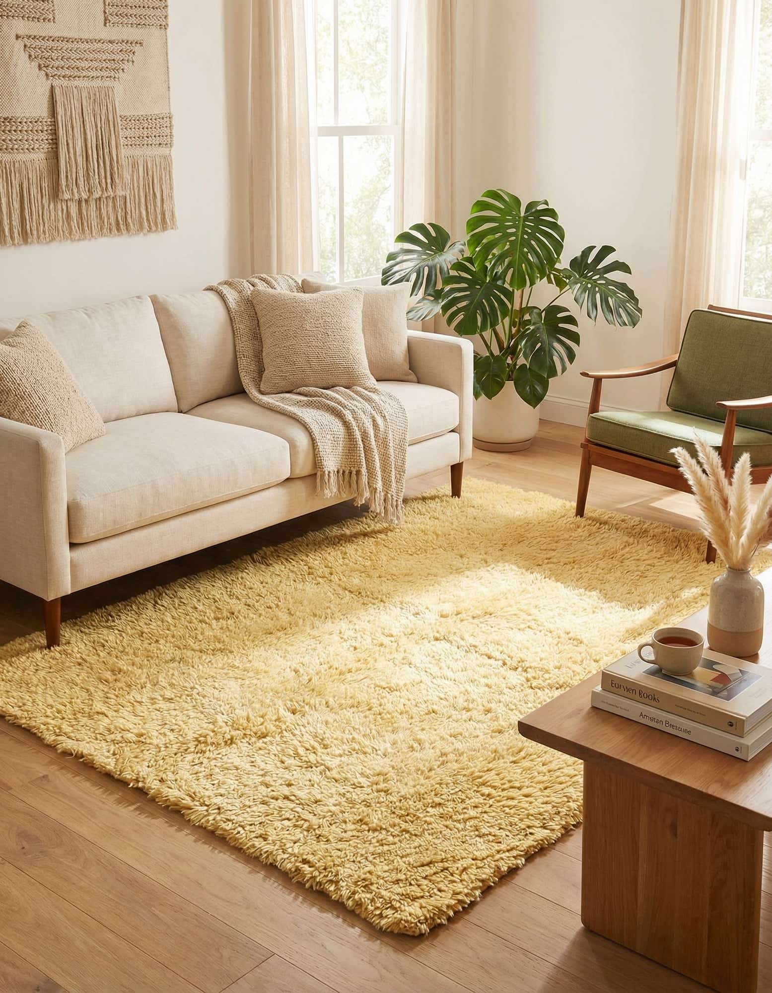 A 4x6 rectangular yellow shag rug with a soft, textured pile, perfect for a modern living room or bedroom.