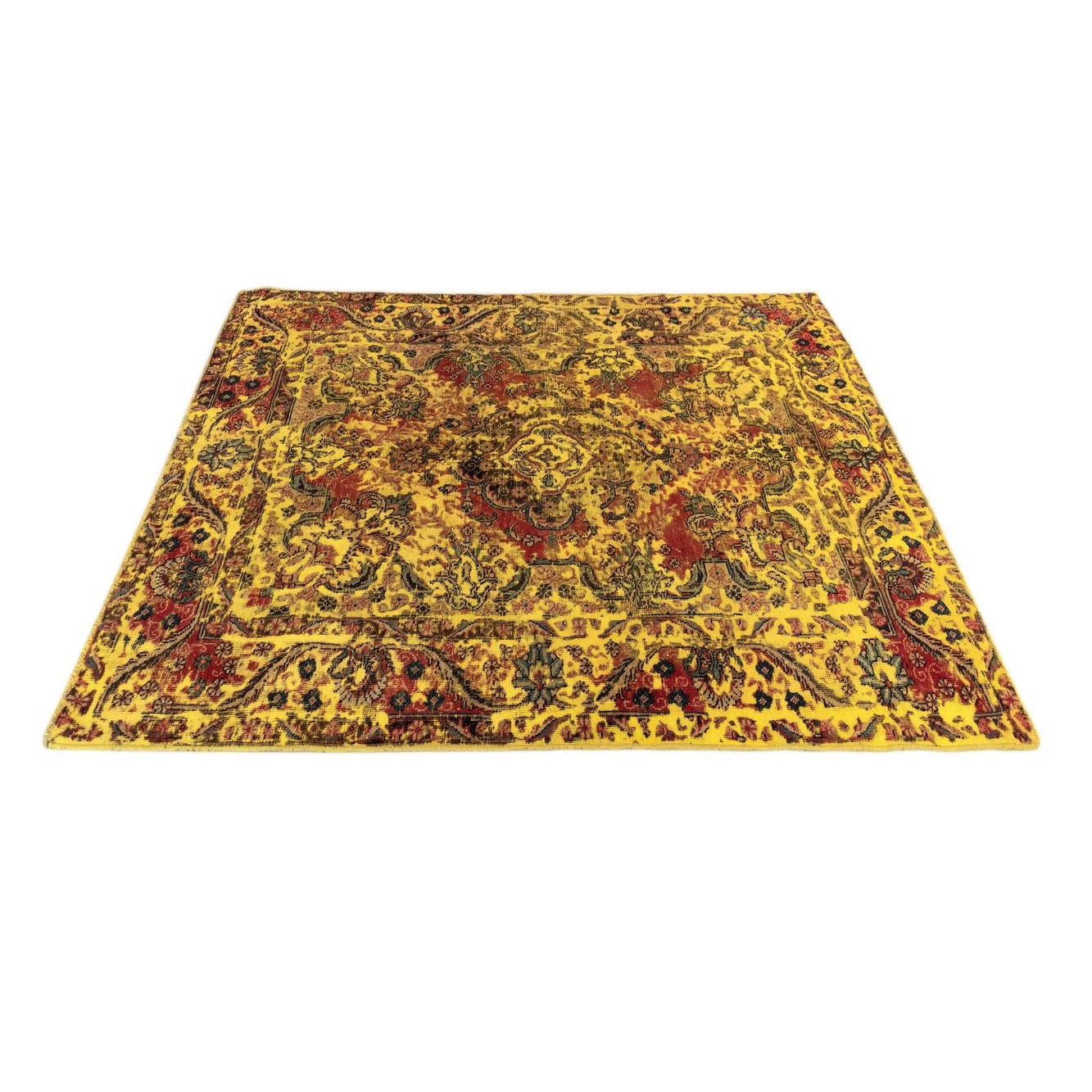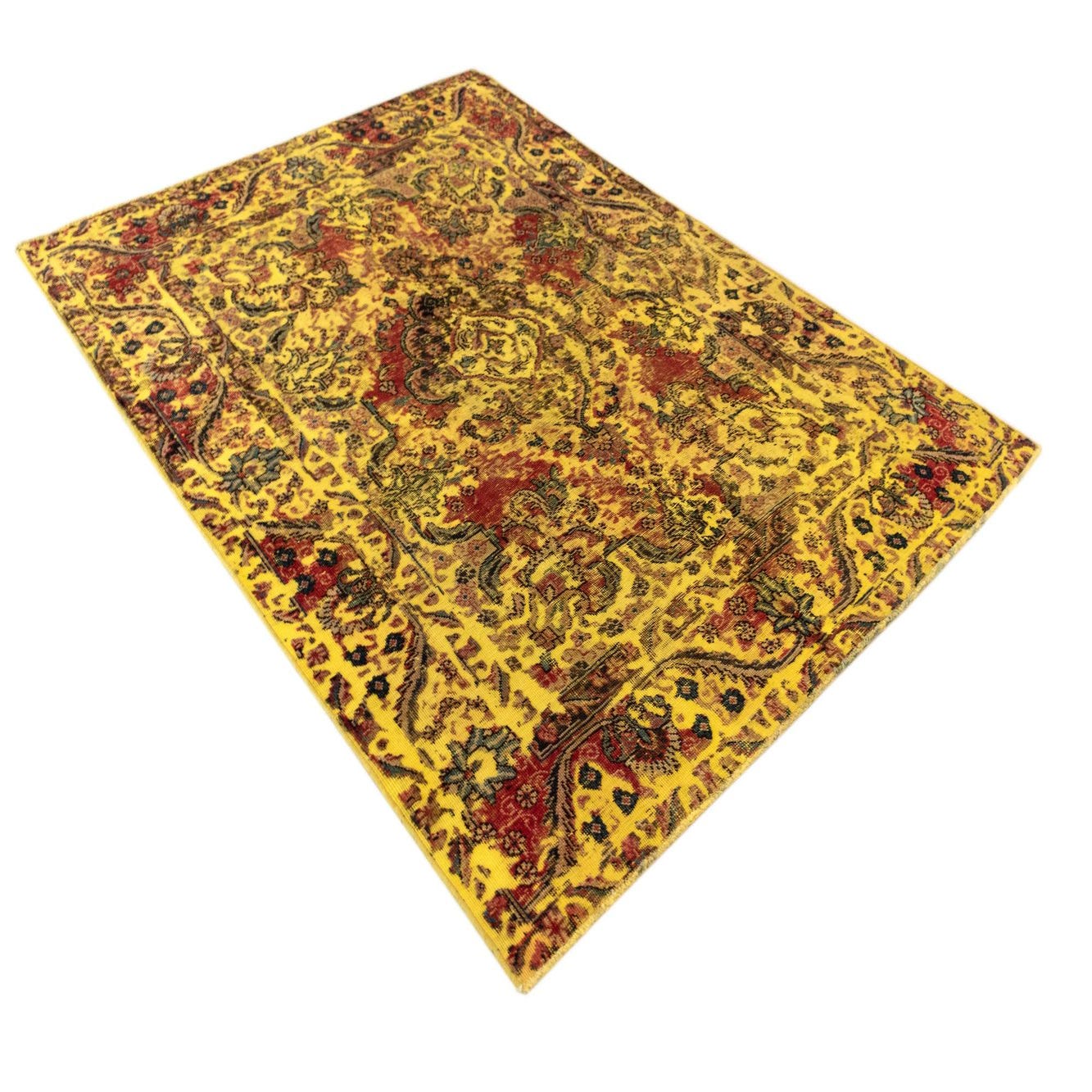 A 4x6 rectangular yellow Persian wool rug with a distressed red and green floral medallion pattern.