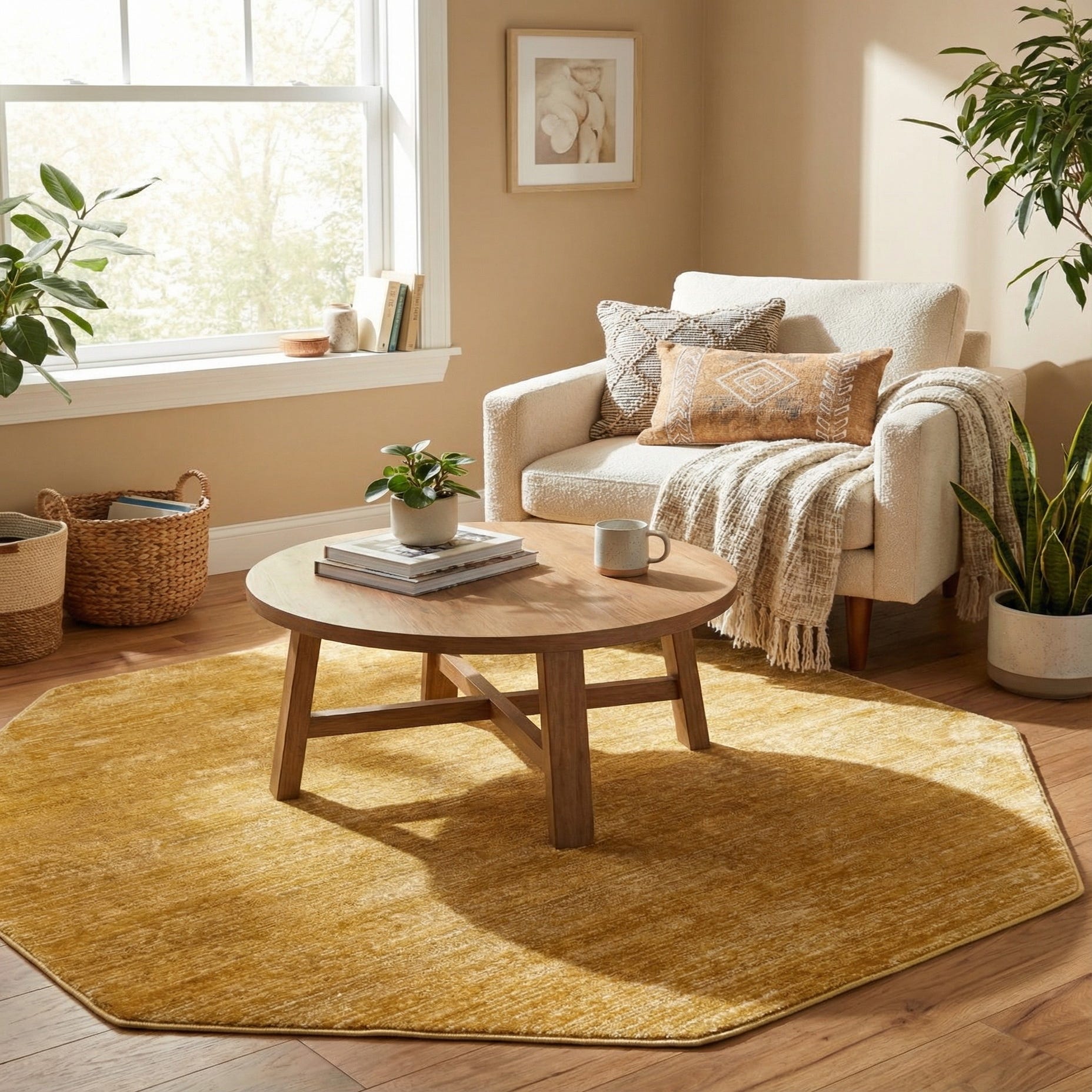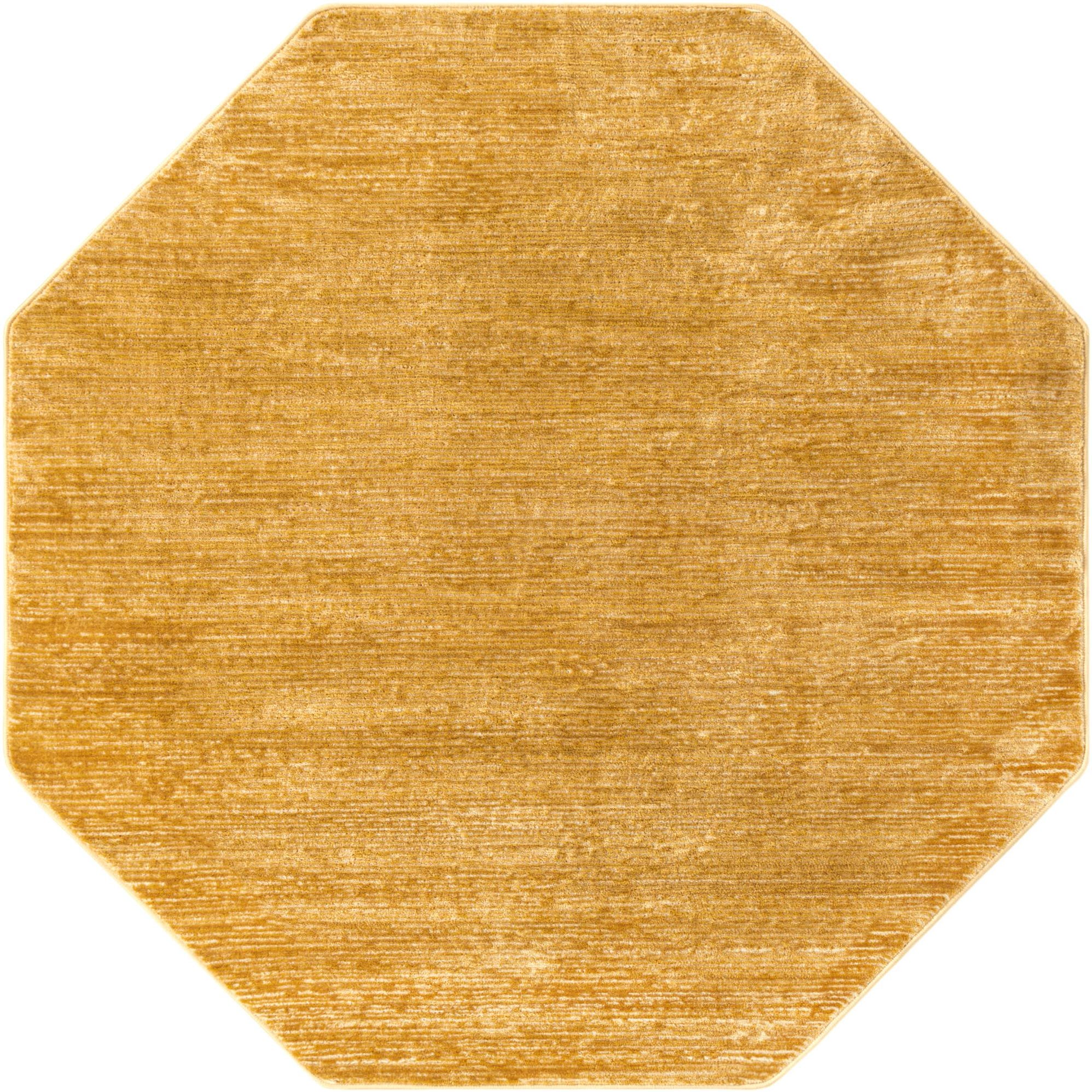 A warm yellow field with gentle tonal striations gives this octagonal rug a soft, velvety presence. The surface catches light with a subtle sheen, creating depth through slight variations rather than a busy pattern. Machine-made from 60% polypropylene and 40% polyester, the pile has a plush, low-to-medium profile that feels soft underfoot while maintaining a neat, tailored appearance.