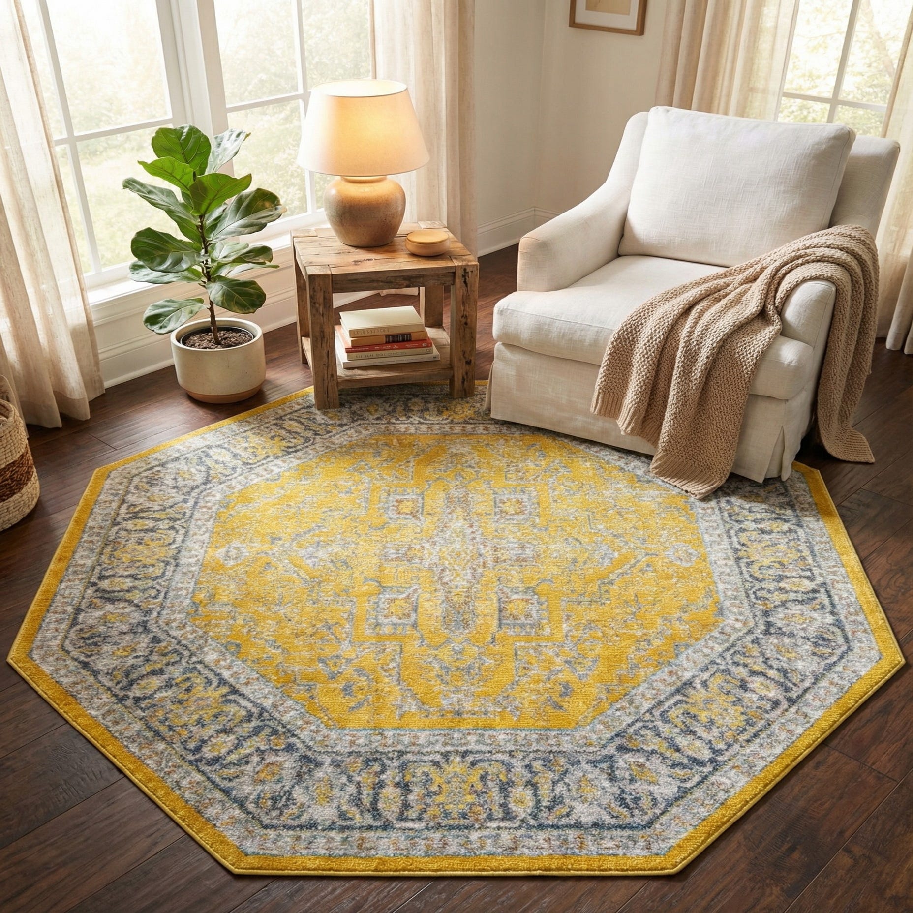 Place this rug in an entryway or foyer to create an immediate focal point, or center it beneath a small round dining table or breakfast nook where the octagon shape complements curved seating. It also works well layered over a larger neutral rug, anchored beneath a reading chair to define a cozy corner, or paired with modern farmhouse or coastal decor to lift a room with warm yellow and cool blue accents.