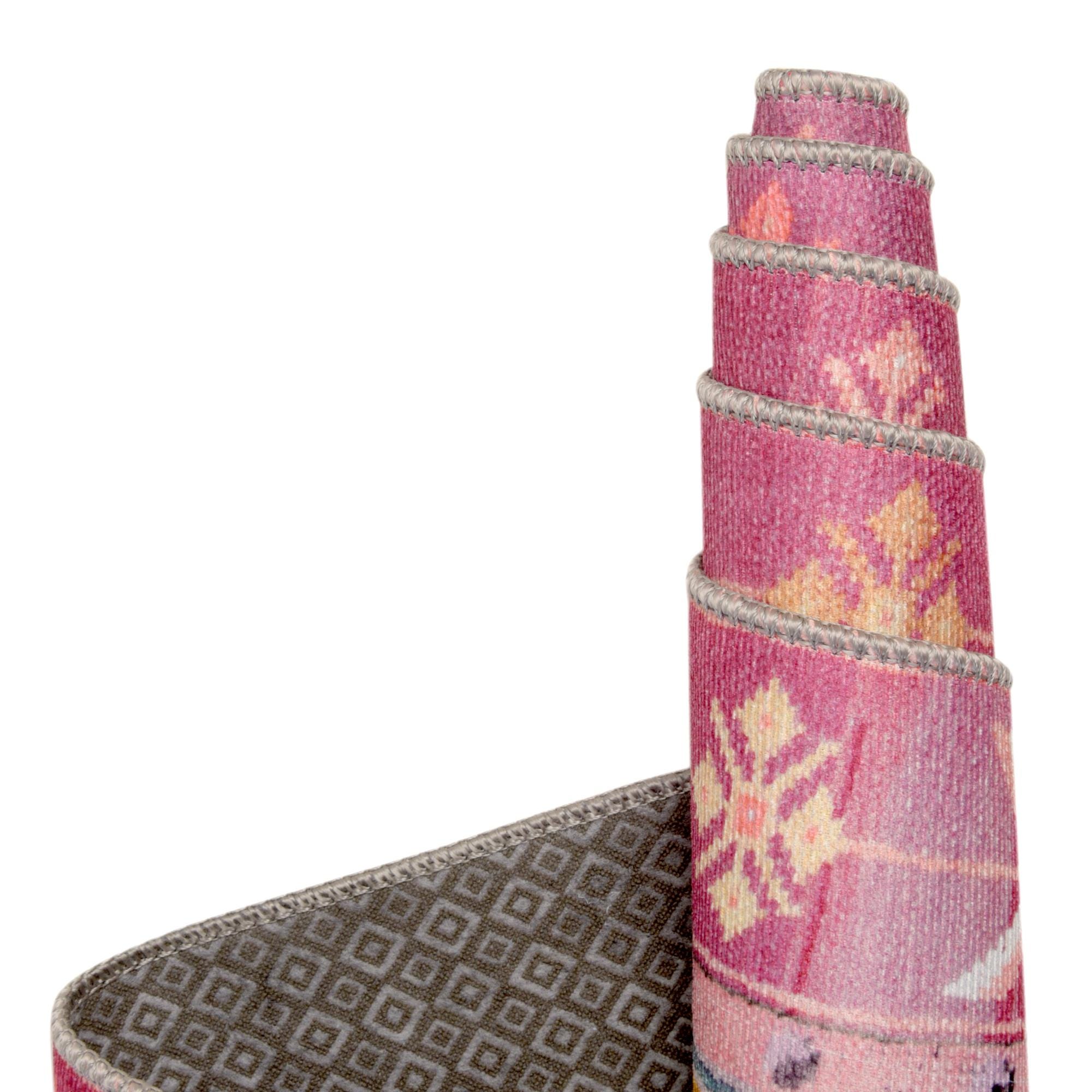 A 5'x5' octagon rug featuring a vibrant yellow field with a central pink, purple, and teal medallion, bordered by a bold pink frame with geometric patterns.