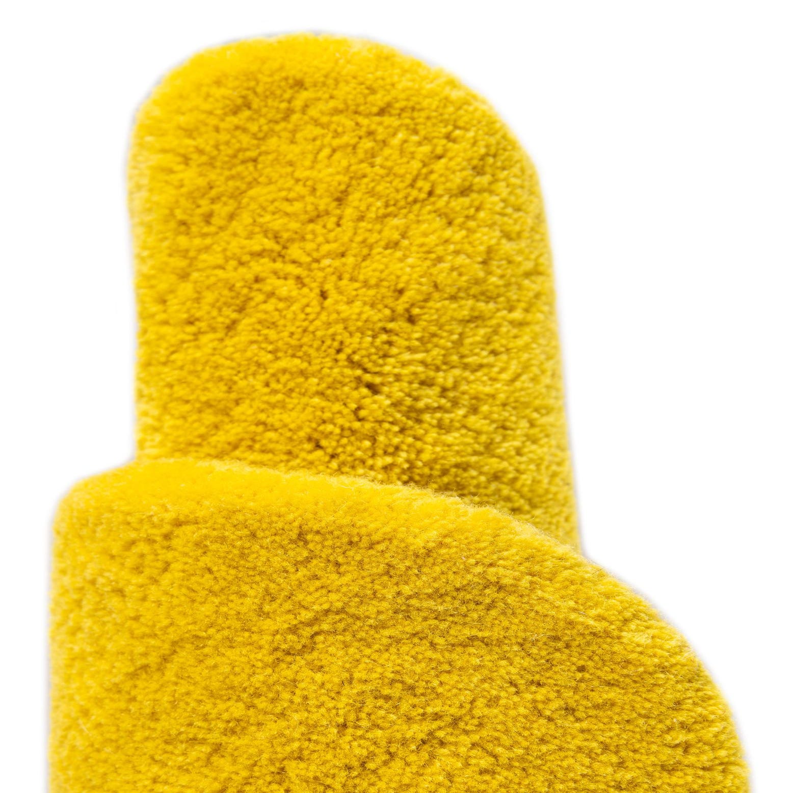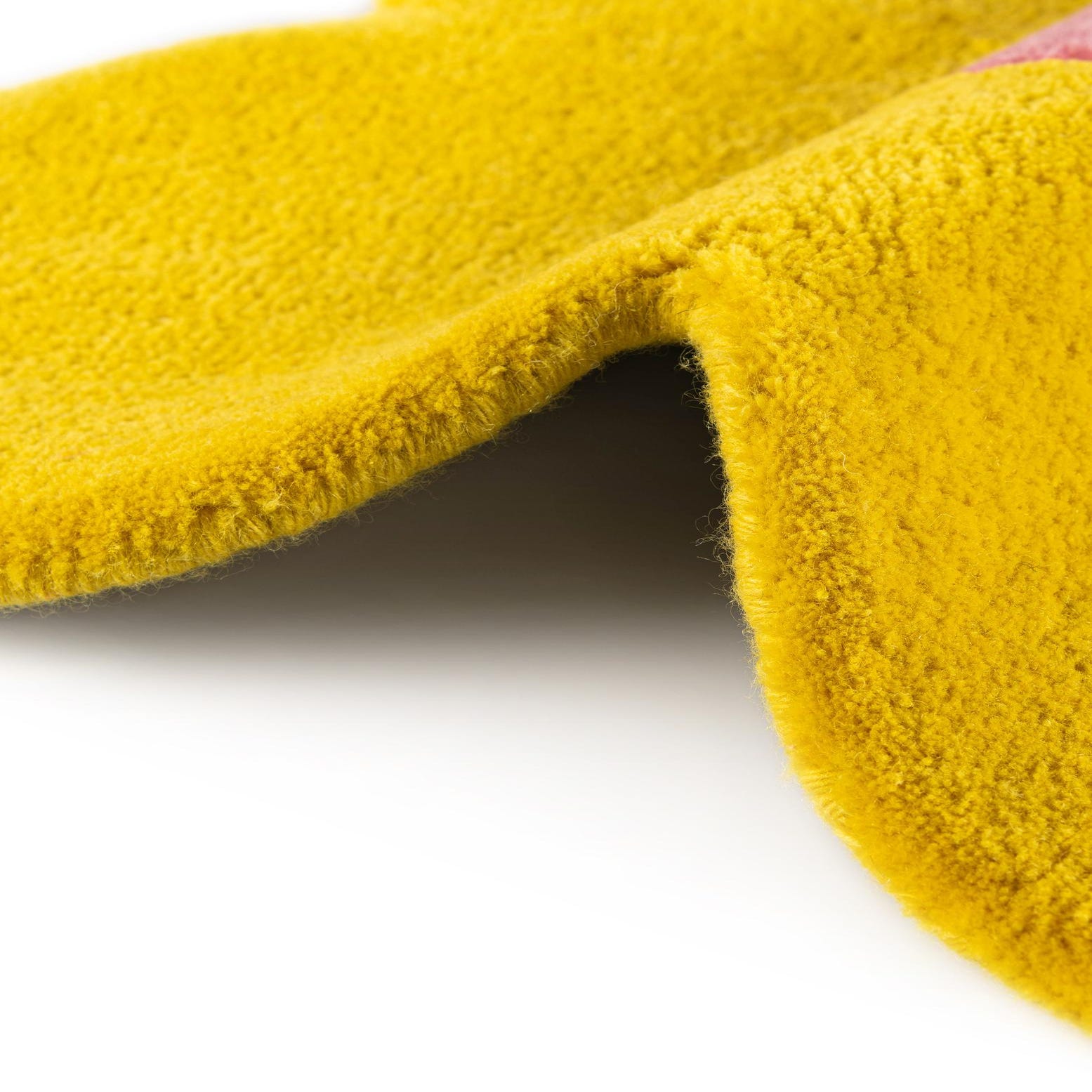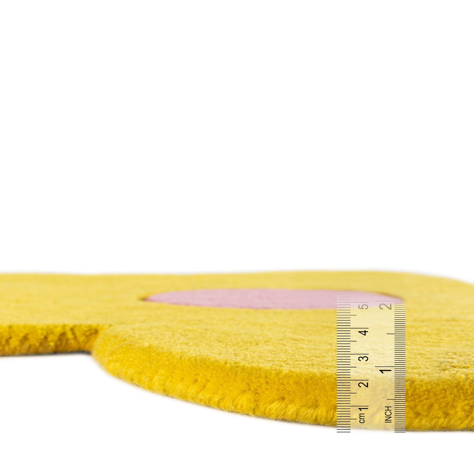 A vibrant yellow flower-shaped area rug with a bright pink center, featuring a high, soft pile.