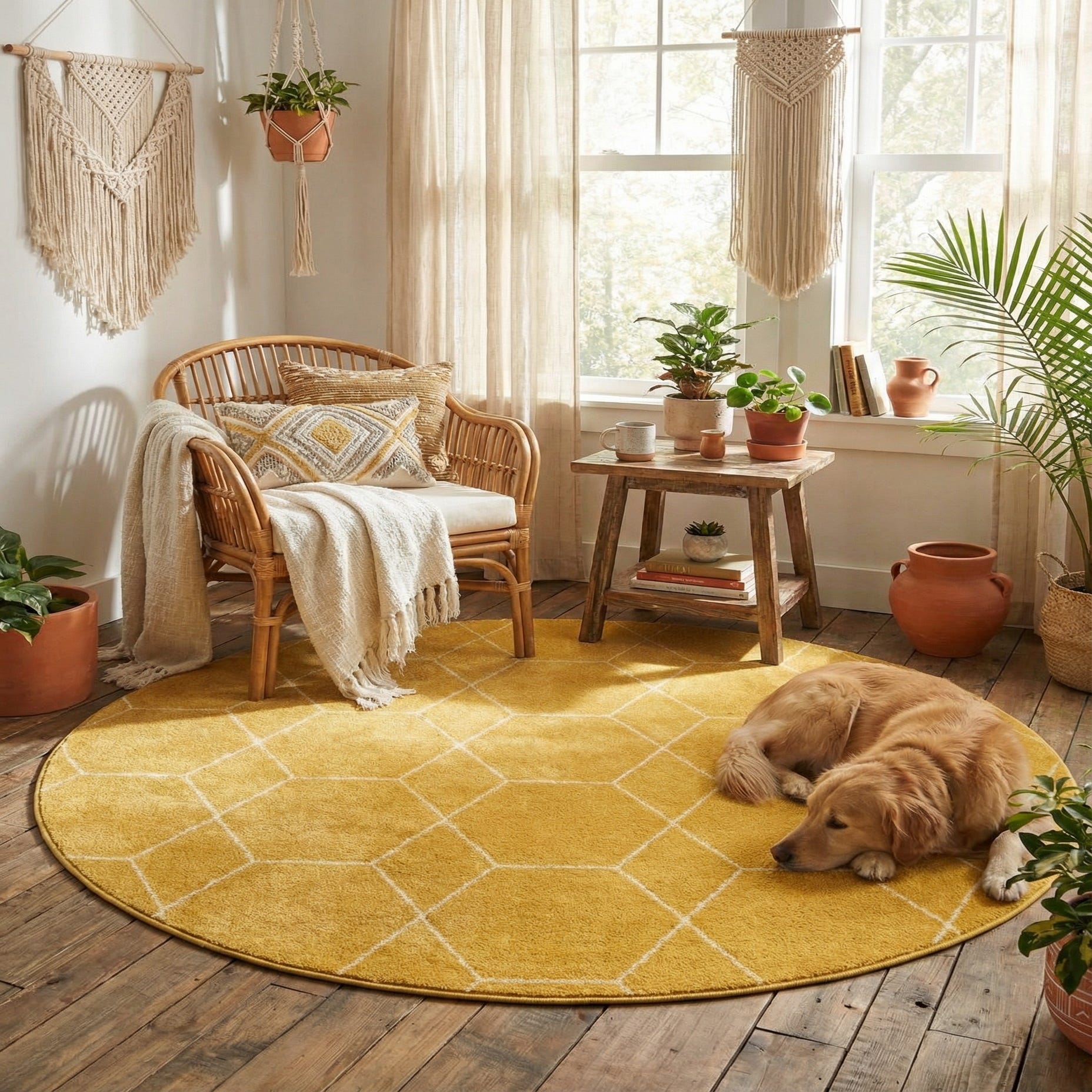 Place it beneath a small round dining table or in a sunny breakfast nook to reinforce circular layouts, or use it as an accent in a living area to anchor a reading corner or pair of chairs. It pairs naturally with light wood tones and white walls for a Scandinavian-influenced scheme, complements navy or charcoal furnishings for a contemporary palette, and can also add a bright counterpoint in eclectic or bohemian rooms layered with plants and textured throws.