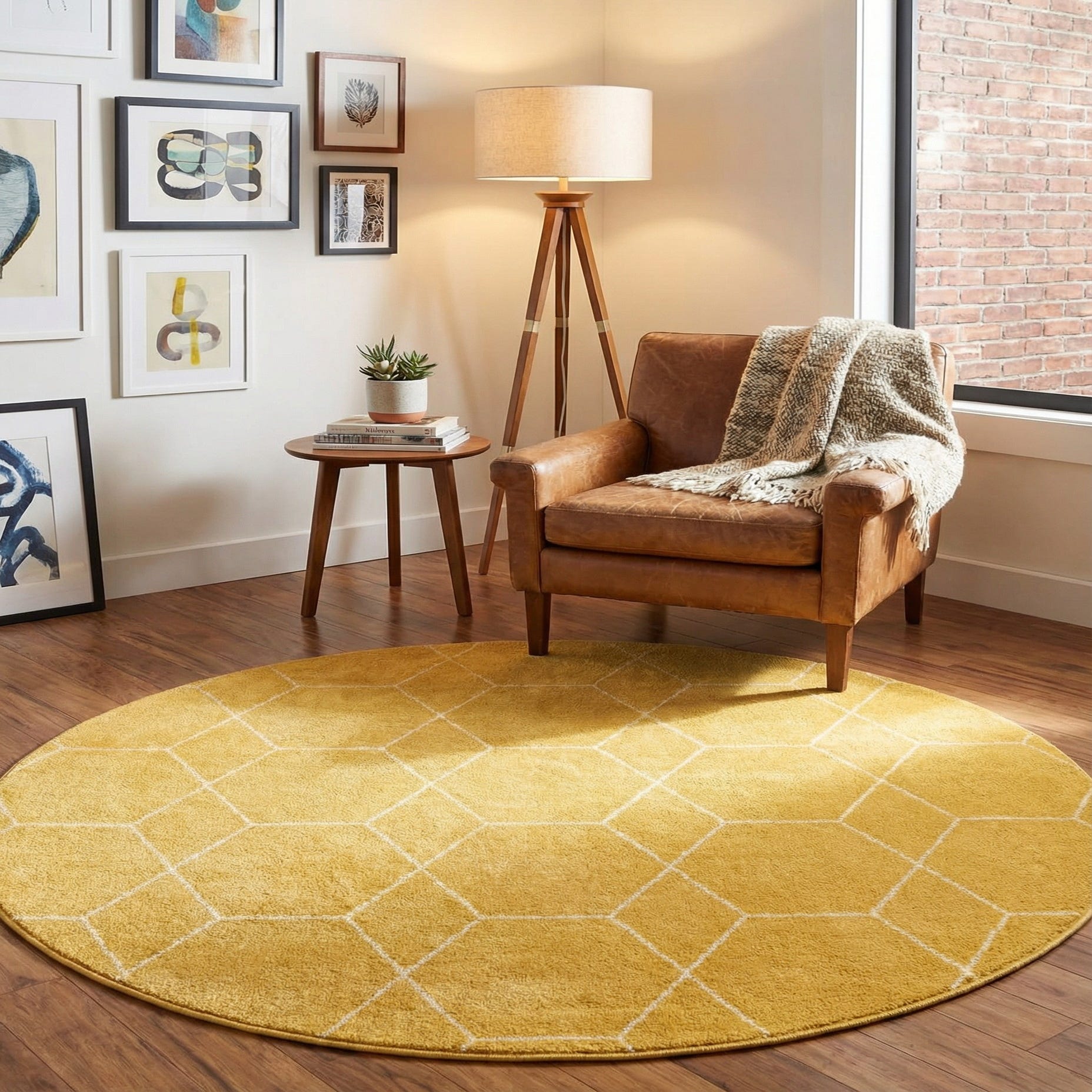 A round rug in a warm yellow ground, this piece carries a clean geometric lattice of ivory hexagons that creates a honeycomb-like motif across the surface. Machine-made of 100% polypropylene, the cut pile is low and dense, offering a soft, slightly velvety hand and a gentle sheen that catches light without overwhelming the color. The ivory lines provide crisp contrast and a measured graphic quality that keeps the look modern yet approachable.