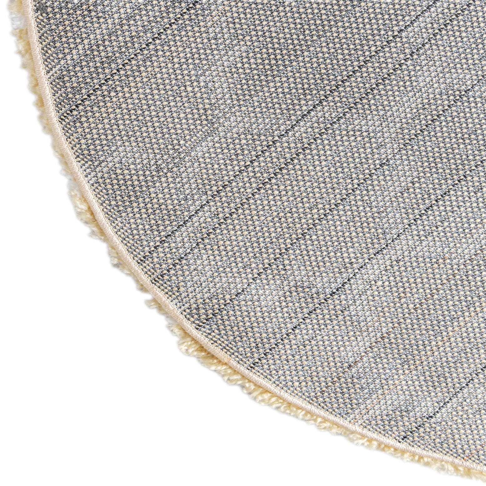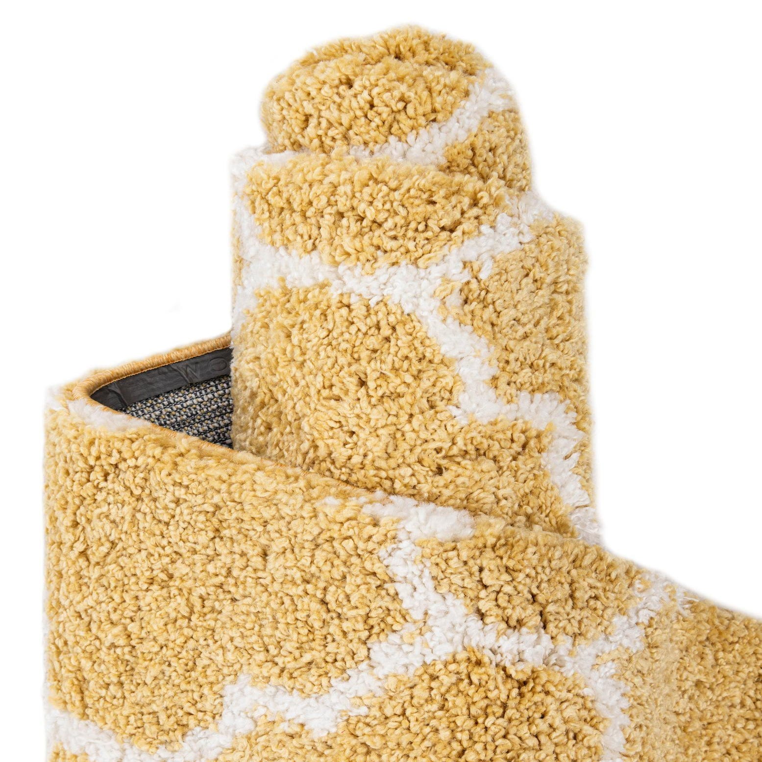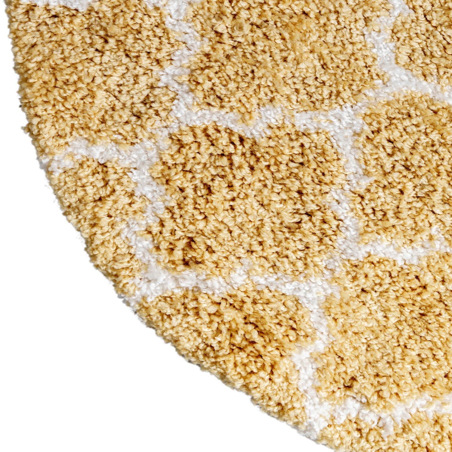 A warm yellow field is patterned with an ivory Moroccan-inspired quatrefoil lattice, creating a geometric yet relaxed look. Machine-made of 100% polypropylene, this round shag has a deep, plush pile you can feel beneath your feet—soft, lofted fibers that add tangible texture and subtle dimensionality. The ivory lines provide clear contrast against the sunny background, giving the design definition while maintaining an inviting, casual presence.
