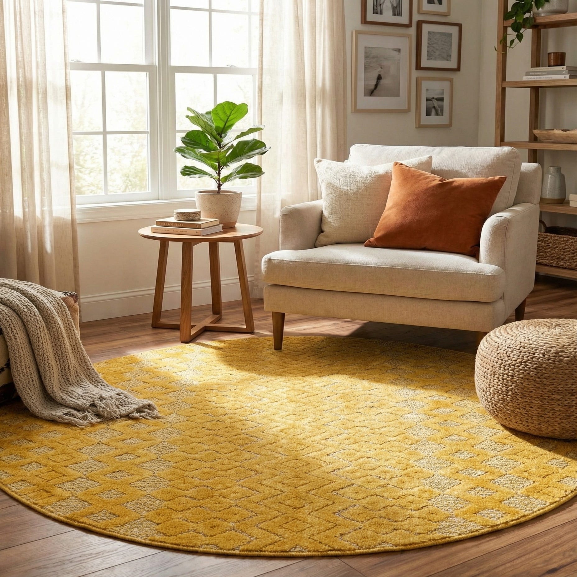 A 5'3" round yellow indoor/outdoor rug with a textured tribal trellis pattern, featuring high-low pile.