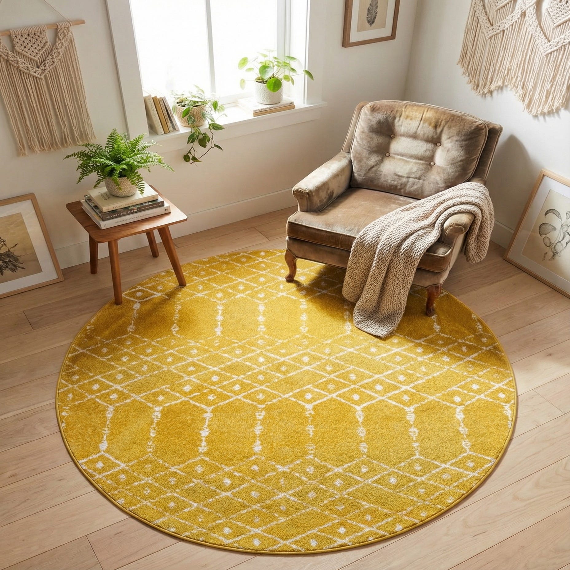 This rug works well as a cheerful anchor in a sunny breakfast nook or informal dining area, and it pairs nicely with light wood or white furniture for a fresh, Scandinavian-inspired look. For bolder contrast, layer it with navy or charcoal accents in a living room or home office; it also complements woven rattan and natural fibers for a casual, bohemian vibe. The lively yellow background brings warmth to children’s rooms, entryways, or reading corners where a pop of color is welcome.