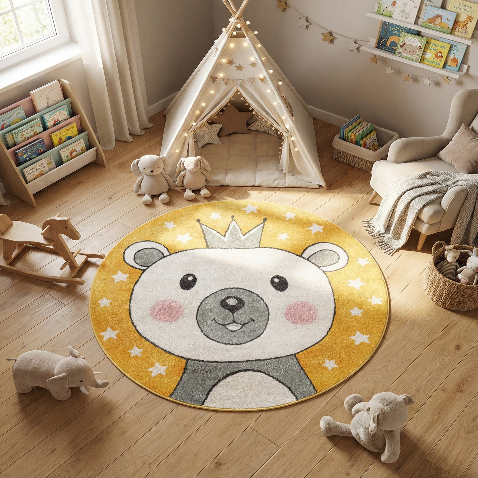 A cheerful round rug with a friendly bear portrait set against a sunny yellow background. The design uses bold black outlines to define the face, crown and scattered stars, while ivory and mid-gray fill the bear’s features for a soft, graphic look. Machine made from 100% polypropylene, the rug has a low, plush pile that feels comfortable underfoot and keeps the motif looking clear and consistent.